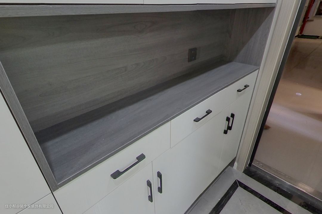 这边鞋柜的地方我们做的简单的隔层,加上黑色的柜体,配上白色的柜门,整体效果看起来就更加舒服啦!