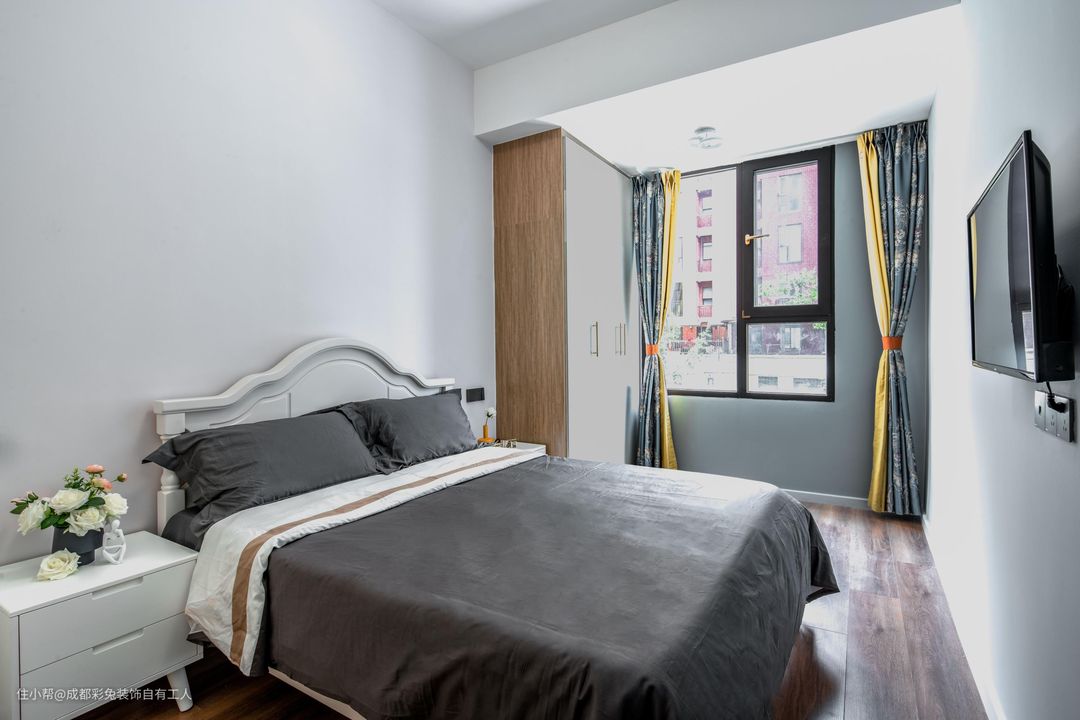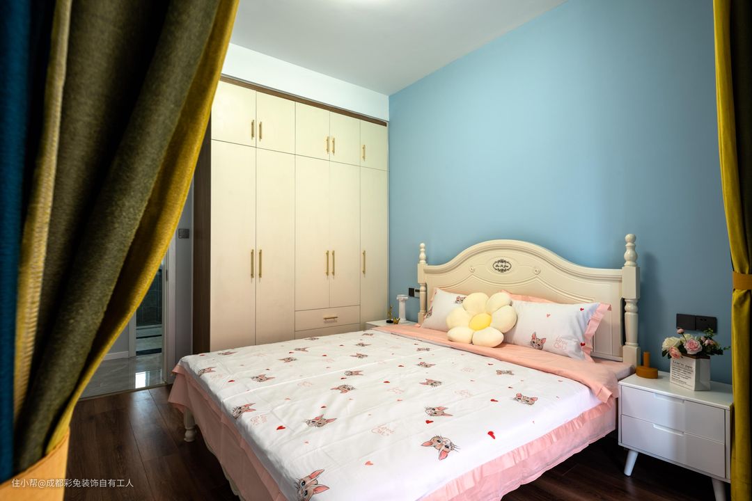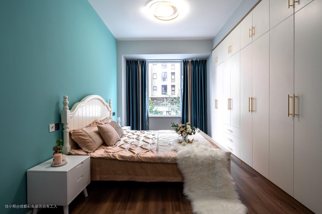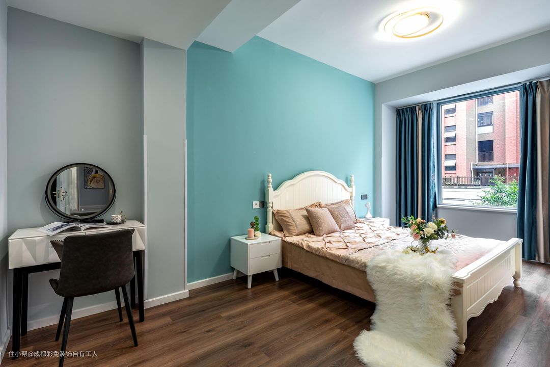 设计师将原有的部分过道和次卫拆改填充进卧室,扩大了主卧的实际使用面积,并结合承重墙留出了更多的收纳空间。水蓝色床头背景墙搭配浅粉色床品,古典与现代相结合的黑白梳妆台,暗棕色的木质地板,整体呈现出自带滤镜的高级感。