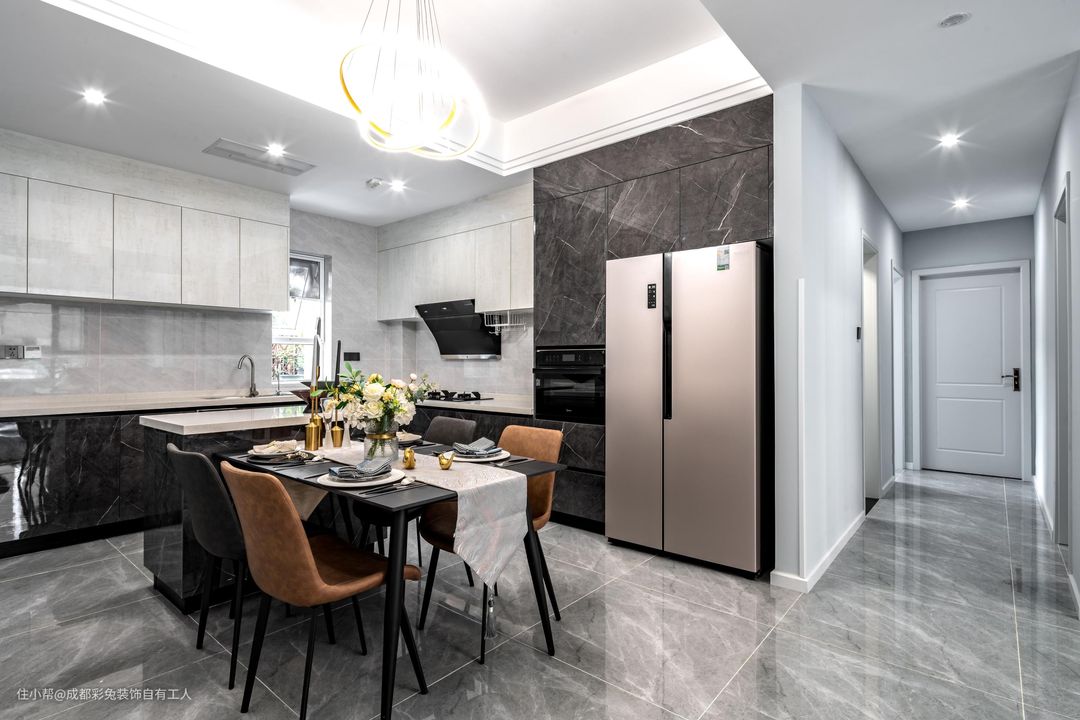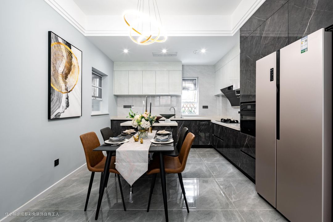 本案的原始户型中,功能区域较齐全,动静分区良好,但某些区域的面积分布还是不太合理,比如餐厅偏小,它虽与客厅相连,在视觉上有一定的延展性,但实际还是过于拥挤。所以设计师重新规划这块空间,将原有的隔墙拆除,让餐厅与厨房“共处一室”,整体没有拘束感,开放式空间更显轻松自在。