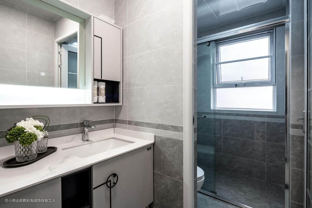 干湿分离的卫生间,在注重空间的实用性的同时,增添了仪式感,浅色系的台面与墙面搭配出时尚质感;玻璃隔断的淋浴房在黑色边框的点缀下,极简而又不失格调。