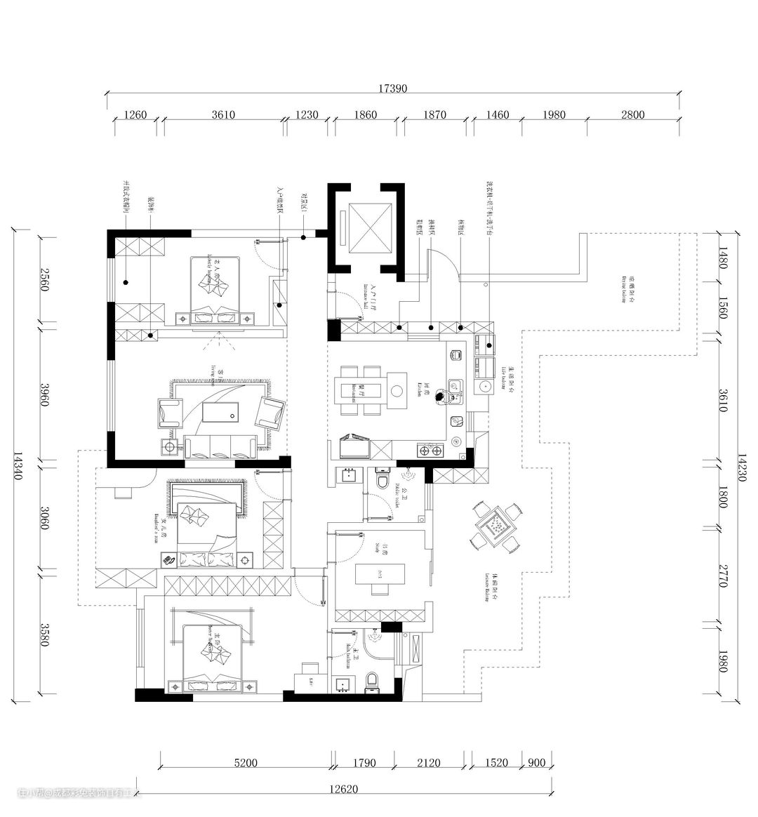 平面布置图 1、主卫不需要浴缸,相对的可缩小部分主卫空间做衣帽间,同时主卧走廊部分做微调使得主卧使用空间增加,能够容纳梳妆台的功能。 2、拆去原本空间隔墙,增加整体房屋采光度和通透度 3、父母房单独设置在入户门位置,一是因为三代人相互作息时间不一致,容易打扰老人休息,二是因为老人房使用率不高。