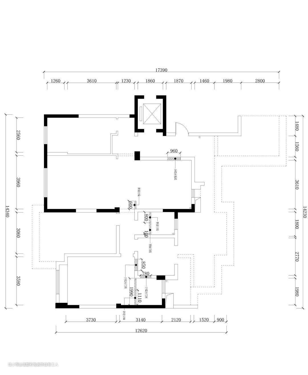 原始户型图 本套户型因为处于一层,有很多赠送面积,所以整体动静线较为混乱。 根据业主需求解决: 1、业主想要在主卧设一个衣帽间。 2、因为处于1楼,整体采光和房屋通透性一定要好。 3、父母房不需要套房,一个老人居住。