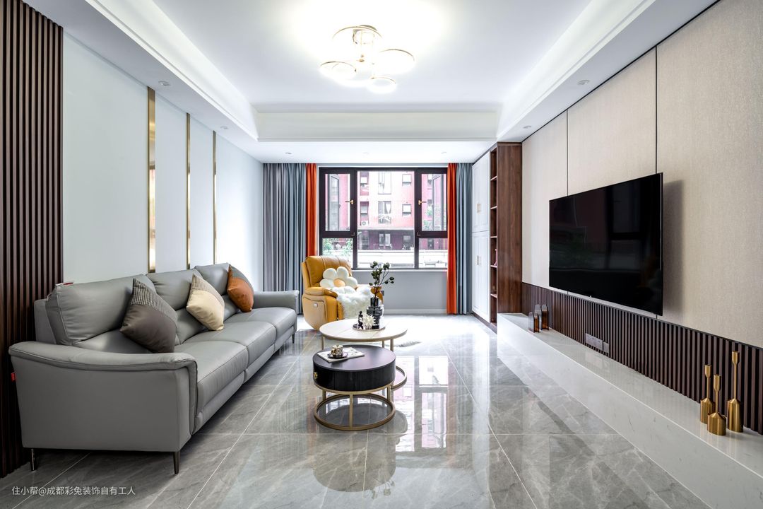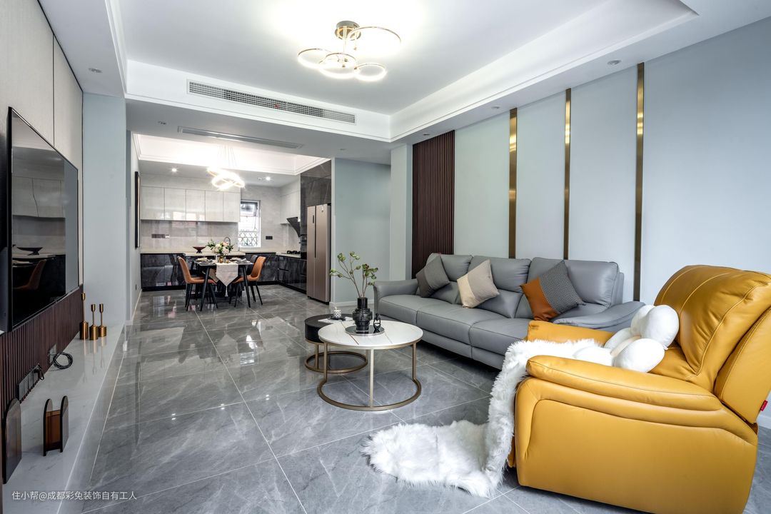 简单的木饰面电视墙,白色与原木色相配的收纳柜,灰色多人+黄色单人的皮质沙发,高低错落的金属小圆几……不同材质的时尚单品,简约而不浮夸,在大理石地板的映衬下凸显了空间质感,为客厅整体营造出更加高级的精致感。