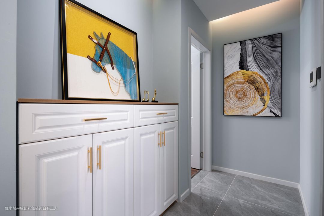 玄关处整体采用浅色墙漆,墙面凹陷处正好放置鞋柜,因为本套案例储藏空间足够,所以鞋柜没有选择整体到顶的鞋柜。过道空间较为狭窄,且鞋柜正面则是入户门,鞋柜选择挂画则可以在一定程度上缓解整体空间带给人的压迫感。
