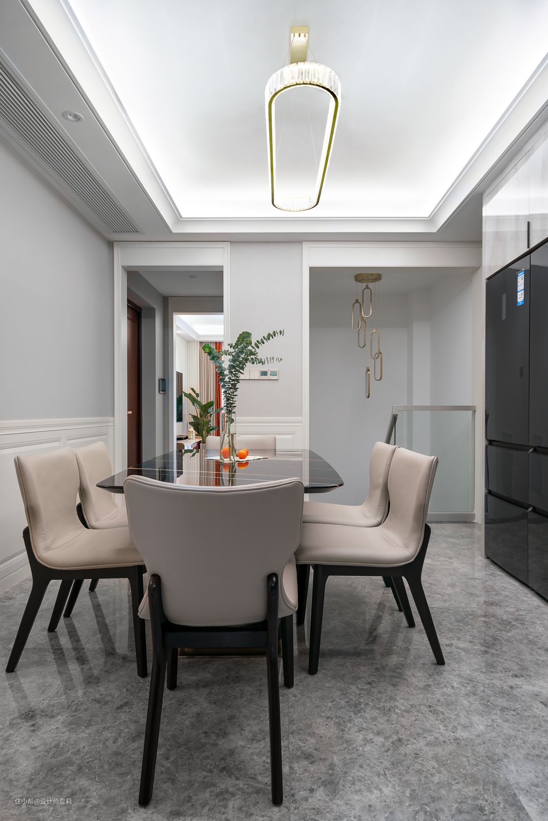 餐厅家具依然选择了轻奢系列,黑色+浅咖色的搭配,让空间的冷暖色调达到平衡,也与客厅的调性彼此相融。