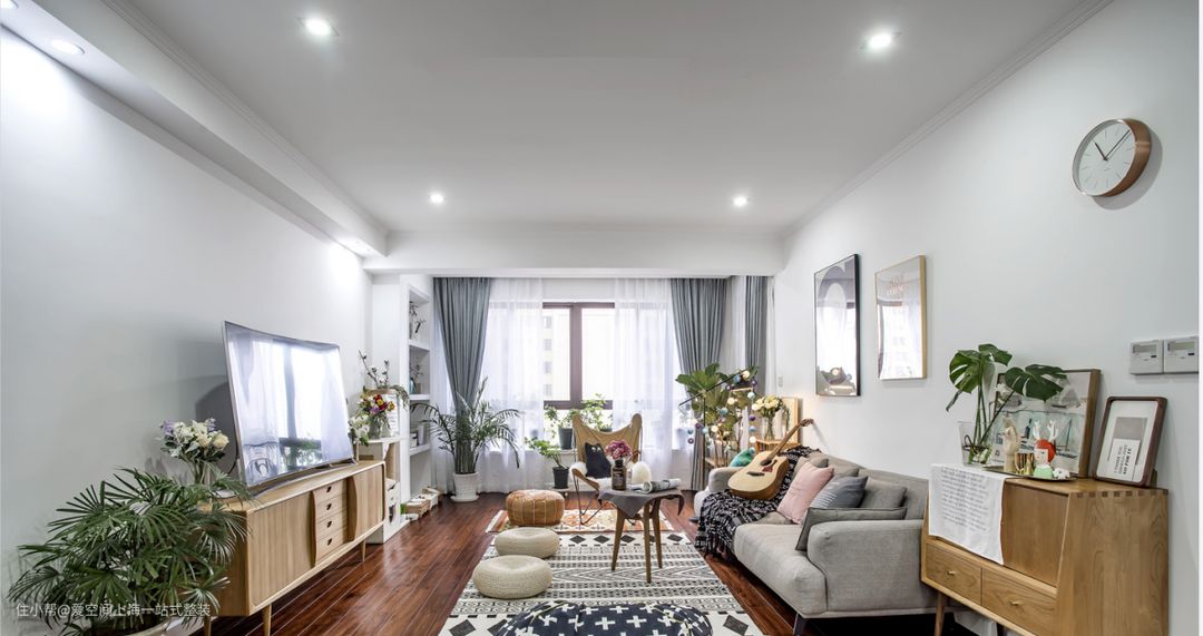 三面白墙+实木地板,空间色调很简单。角落大量绿植和盆栽点缀,空间鲜活有生命力。实木桌子+高级灰布艺沙发,随性自然。阳台打通做墙上壁龛,增加收纳空间。