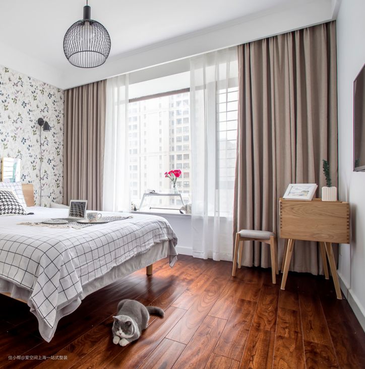 黑色线条吊灯,有空间呼吸感,很通透。飘窗设计为休闲区,搭建一个小桌品茶阅读很安逸。格子床单+碎花壁纸,活泼可爱,很有小清新的舒适感。自由移动床头桌,造型立体,插花点缀,没有自然融入不了的空间。