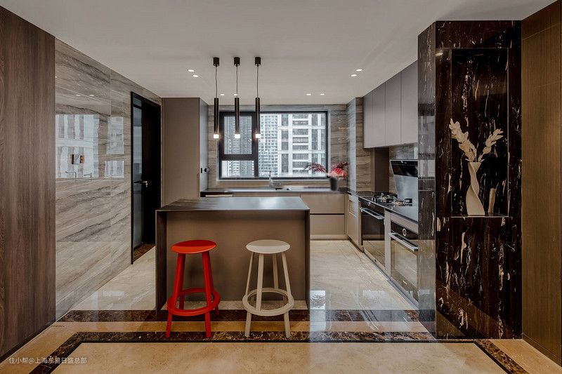 烤箱、碗碟消毒柜都做了嵌入式的处理,满足实用性的同时又能保证垂面空间的极致利用,同时还不会影响整体美观大方。靠窗做了洗菜和备菜区域,保证敞亮通透的空间光线。墙面使用了灰色纹理的瓷砖铺贴,营造质感大气的空间。