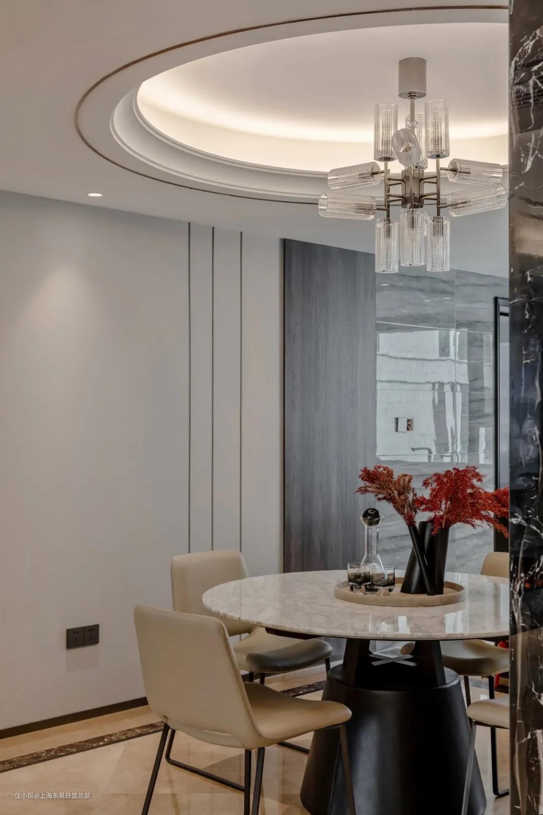 餐厅和厨房做了开放式的设计,圆形的抬高吊顶呼应圆桌设计,搭配精致的水晶灯,让空间更显轻盈浪漫。地面仍旧使用了浅米色地砖,通过粗犷的波打线来划分功能区域,同游又保证视觉上的敞亮大气。