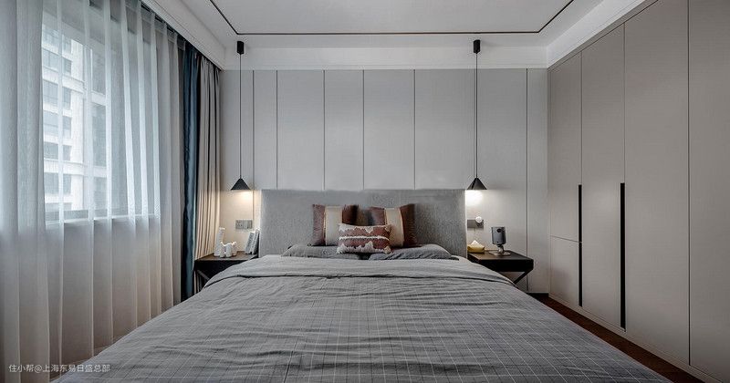 次卧空间使用了简约高级感的灰色调,平面吊顶搭配无主灯设计和线性装饰,保证舒适层高的同时又不是精致感。整体橱柜通顶设计,最大化利用垂面空间,满足次卧的收纳和储藏功能。线性装饰的背景墙和线性橱柜的组合,让整个空间更显利落大气。