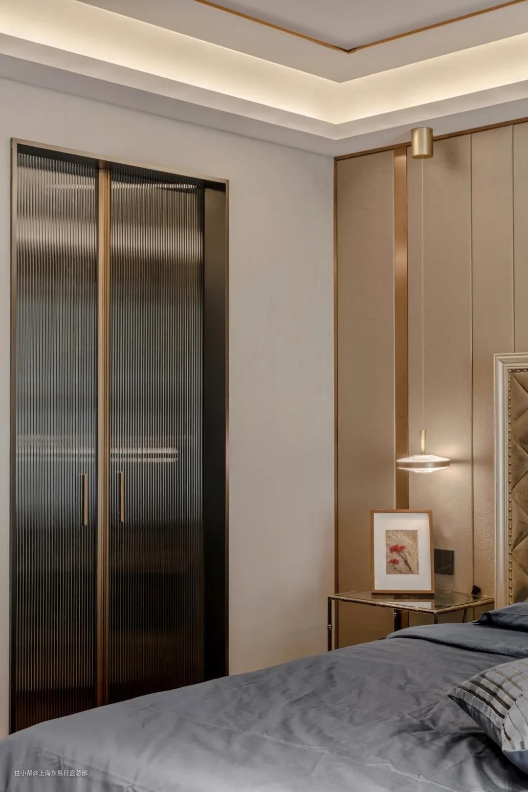 无主灯设计搭配床头吊灯,睡前躺在床上看书玩手机也会更加舒惬。床头柜也非常个性,一侧使用金框玻璃柜子,呼应轻奢的调性,另一侧则做了抽拉式的米白色柜体,保证基本的储物需求。长虹玻璃材质做衣帽间门,让原本阴暗的衣帽间更加敞亮。