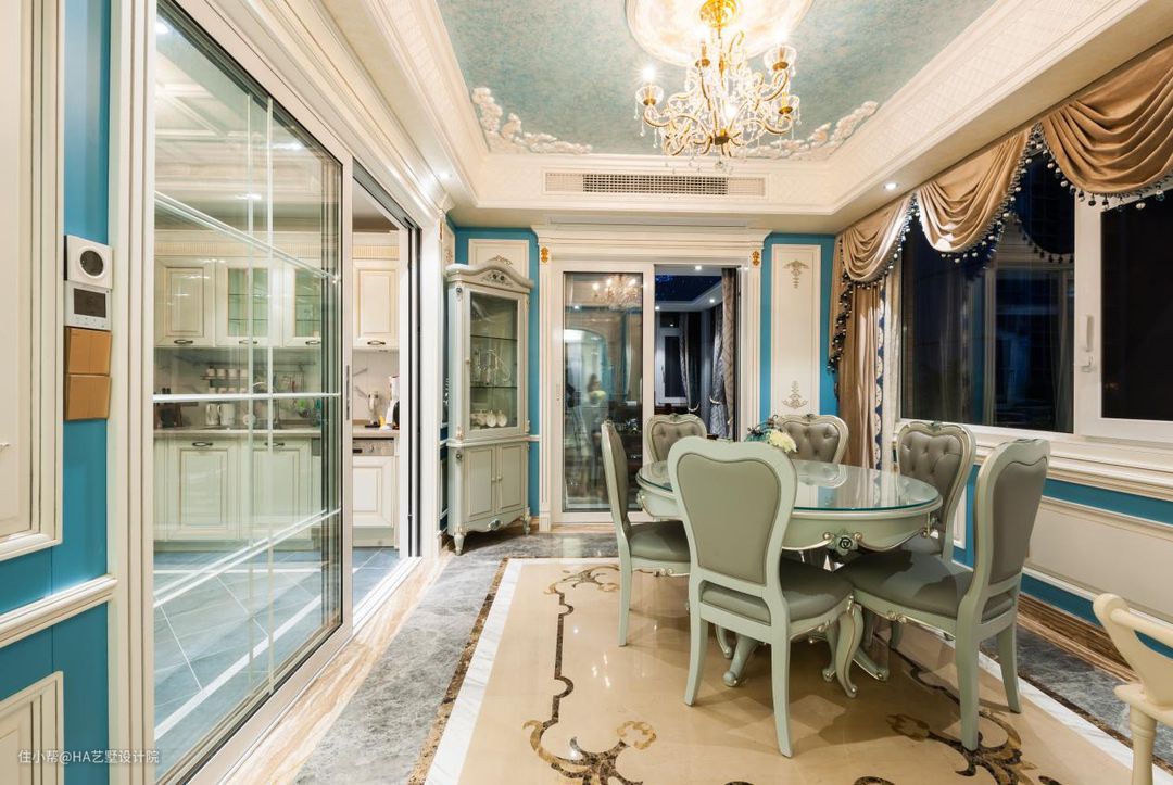 餐厅和厨房紧紧相连,上方做了淡蓝色的吊顶,四角配有精美的雕花,中部有一款烛台式的水晶吊灯,看起来也是非常漂亮。餐厅靠墙角做了三角形的收纳柜,将空间利用最大化, 增加了收纳空间。餐桌选用圆形样式,淡淡的青色非常时尚。靠窗的棕色窗帘做了一个又一个的半圆形状,让空间仿佛都运动起来,很有动感。