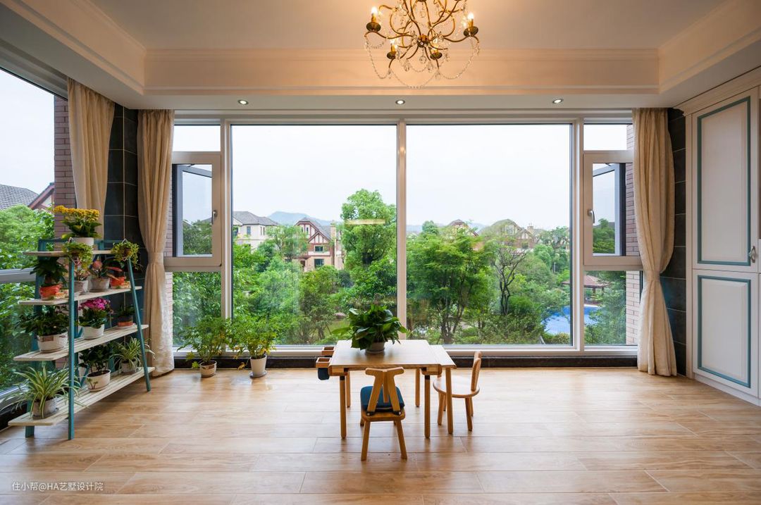 房间内留有一处大阳台,这里以浅棕色的木地板进行通铺, 给人一种温暖温馨的感觉,阳台其中一面墙打造成为收纳柜,用于补充收纳空间,另外两面向阳的墙面全部做成了落地窗,室外绿荫葱葱,美好的景色都能尽收眼底。阳台一侧还配有花架,业主可以种养一些绿植,中间便是孩子的天堂了,儿童专用方桌可以让孩子在这里娱乐玩耍,茁壮成长。