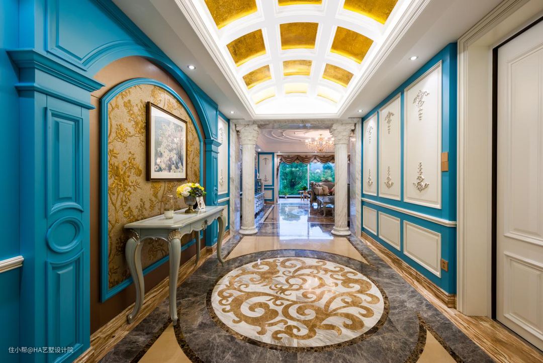 过道的设计也是非常漂亮,上方吊顶做了时空隧道般的感觉,圆弧形的设计配上棕色色块,给人一种仿佛去参加美术展览的感觉。过道两侧墙壁以蓝色作为主色调进行勾勒,配有法系装饰画,另外在和客厅交汇处还做了柱子,让这片空间内的设计元素更加多元化,棕色的地板上方做了圆形的 大型花纹图案,同样起到提升浪漫气息的感觉。 08阳台