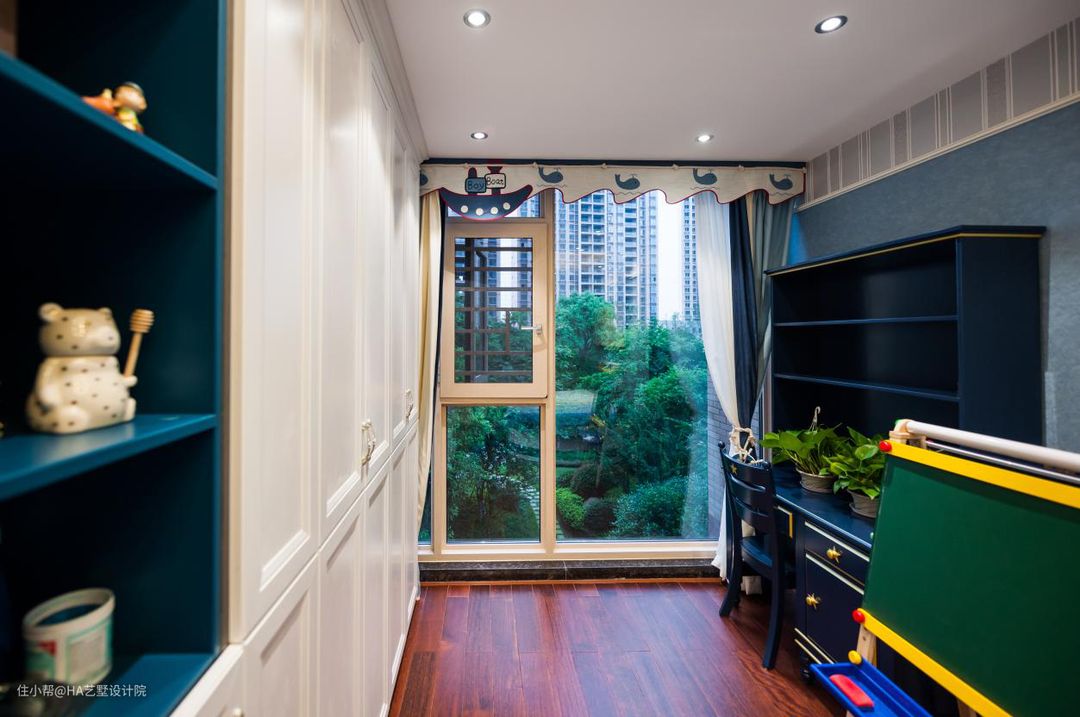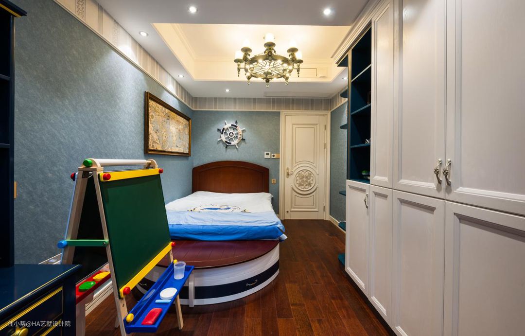 男孩房地板以深棕色木地板进行通铺,奠定了温馨的感觉,墙面选用一款浅蓝色墙纸铺贴而成,渲染出一种男孩生机与活力的感觉。