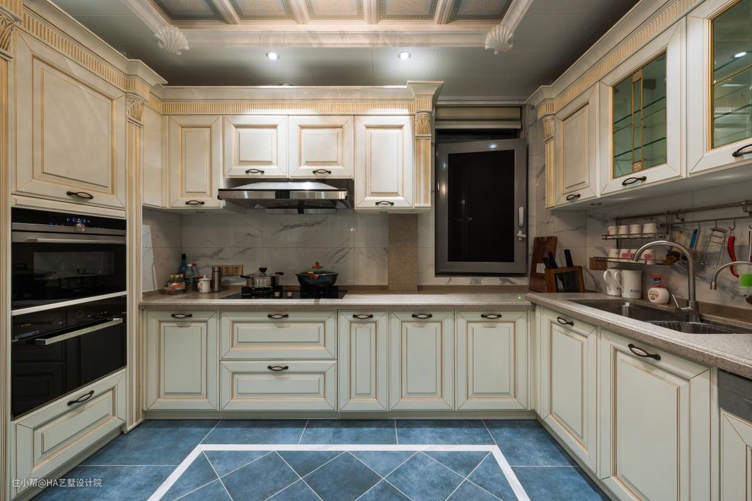 厨房主要选用白色调作为主色调,上下两层都做了橱柜,电器全部采用内嵌式的处理,所以橱柜表面形成一体,干净整洁。地板选用蓝色的瓷砖进行铺装,并且设计出了各种不同的纹路,变化感十足。厨房留有一处小窗户可以用来通风, 较大的操作台面而能够满足2到3人的共同工作,使用起来更为方便。