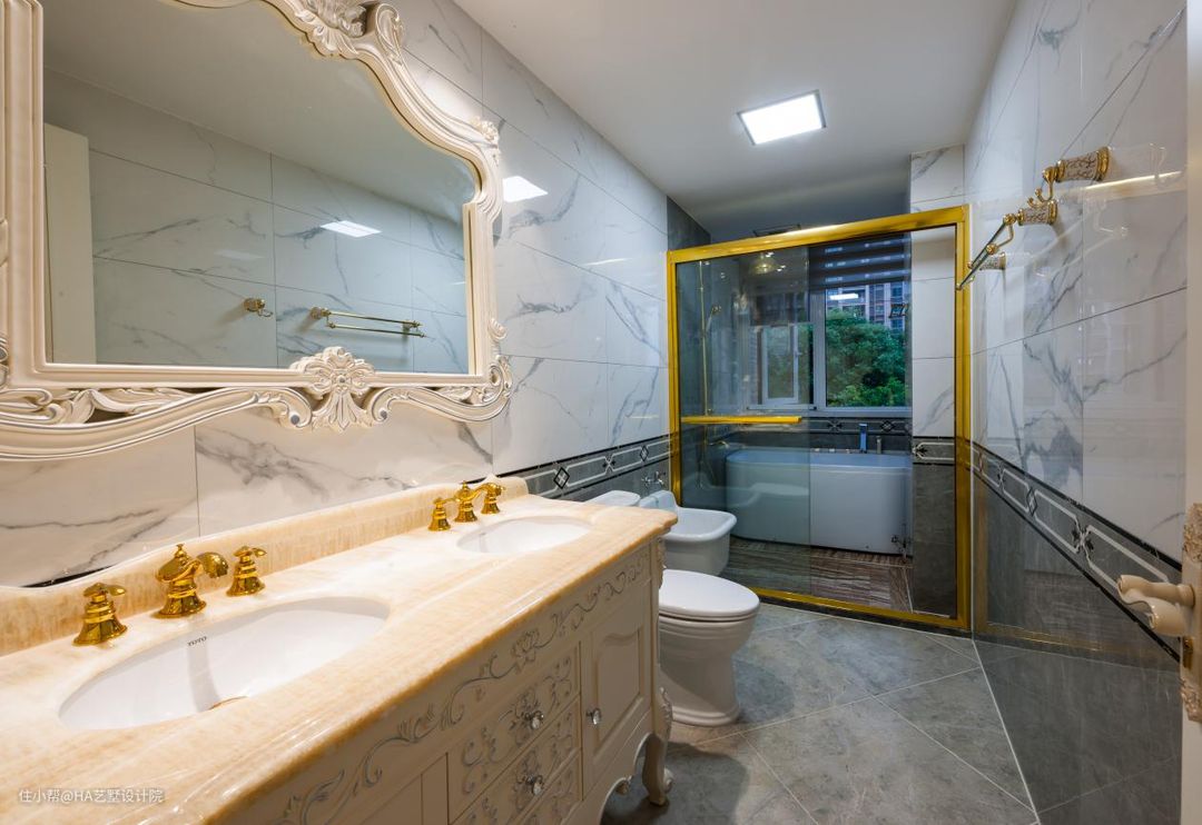 卫生间整体做了干湿分离的设计,中间以玻璃推拉门隔开, 内部设有淋浴区,并且根据业主要求设置了浴缸,外部便是 马桶和洗刷拖把的地方,卫生间设置了一处能够供两人同时洗漱的洗漱台,台下盆的设计能够让卫生更好打理,梳妆镜的四周做了精美的装饰,非常漂亮。 07过道