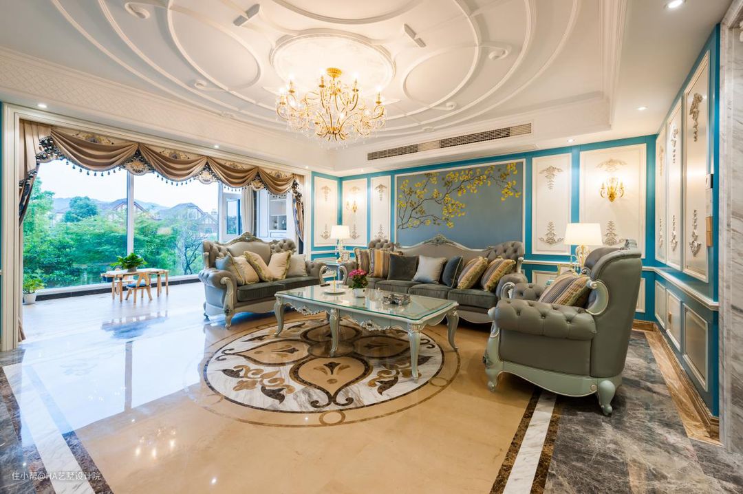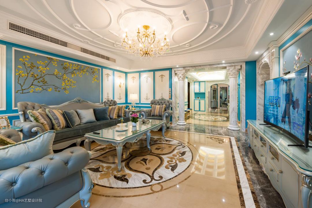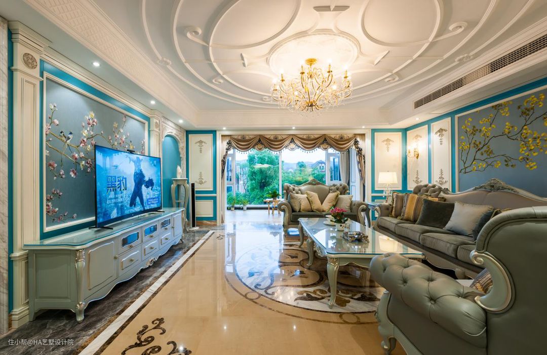 客厅的面积非常大,上方做了巨大的吊顶,并且用石膏线做了椭圆形的花纹勾勒,视觉效果非常漂亮,中部配置了一款 造型复杂的水晶吊灯,灯具金光闪闪,也客厅奠定奢华的基础。 客厅整体墙面打造了一块一块的白色饰面板,上面有一些简单的花纹图案,浅蓝色的线条进行补充勾勒,符合法式浪漫的感觉。