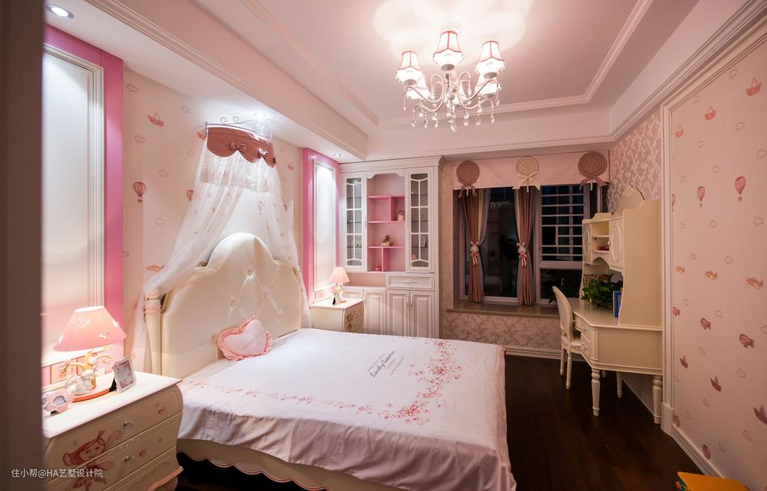 女孩房的设计主要以粉色调为主,彰显出可爱的氛围。室内墙面主要以粉色带有热气球图案的墙纸进行铺贴,床头处还做了薄纱进行装饰,将法式的浪漫体现的淋漓尽致,室内设有飘窗一处,两侧各做有收纳柜和写字台,这样男孩子和女孩子都有自己的学习空间,孩子也特别喜欢这种设计。
