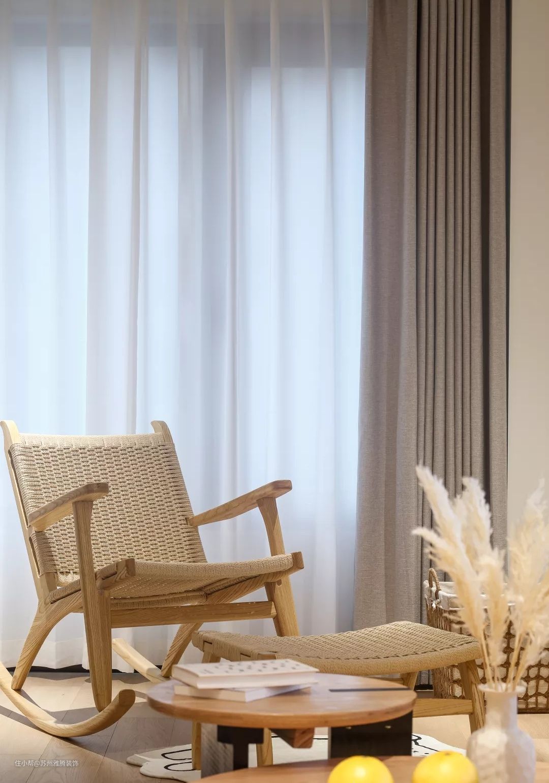 客厅与阳台之间的门套采用黑色不锈钢,很有质感,阳台作为生活和休闲使用。在沙发旁的边柜上一副且慢很符合本案整体的设计理念,走进日式慢生活,感受生活原本之美,在工作和生活之间,找到平衡,不偏离自己的节奏,在缓慢而有序的状态中,实现品质的生活。