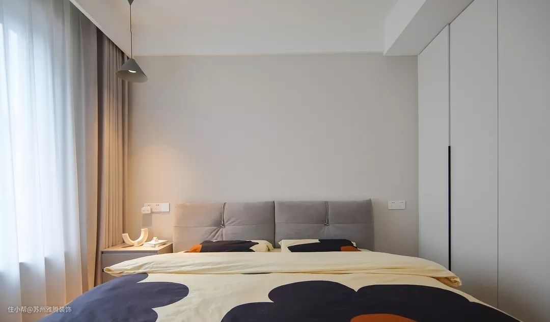 主卧简单纯粹的睡眠空间,一组定制到顶的衣柜增加收纳,床头背景墙和床头靠背不同浅灰色搭配,高级有质感,单边的床头柜和吊灯搭配,明快的床品搭配,营造生机与活力的氛围。