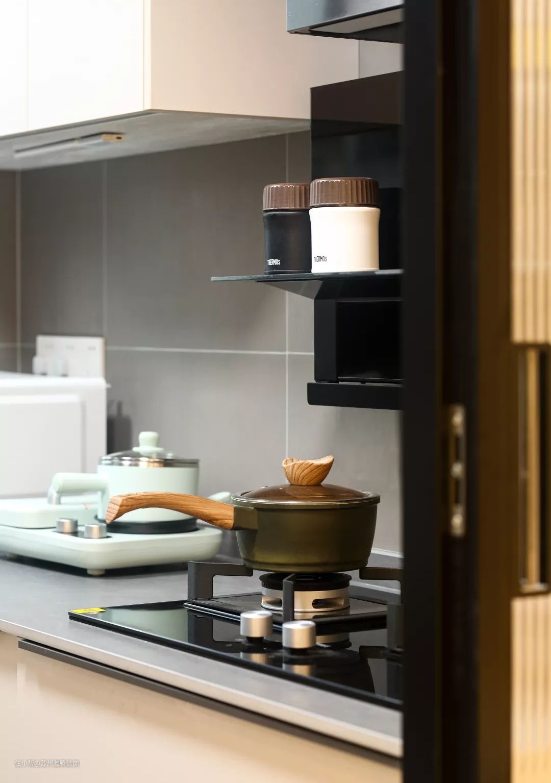 原始厨房北边的窗户结合玄关柜,为了不影响采光,保留窗户定制了矮柜,增加收纳,窗帘选择百叶窗,光线可随意调节,增加空间的灵动性。