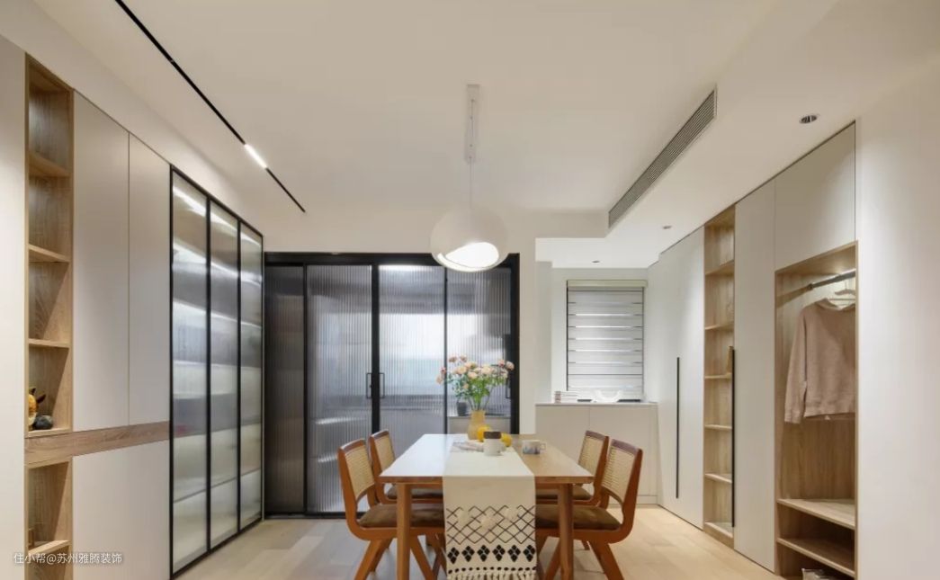 将原始的厨房玄关餐厅空间重置,重新规划,使得南北空间更通透,宽敞,明亮。玄关进门靠墙定制一整排到顶的柜体,鞋柜+衣柜+装饰柜一体。 封闭式与开放式结合,柜体内嵌灯带,增加层次感。餐厅空间的设计,靠墙定制一排集装饰柜+收纳柜+餐边柜为一体的柜体,开放隔板摆放装饰品,封闭门柜体收纳日常物品,玻璃柜主要作为餐边柜,放置碗盘餐具用品。 柜子里面设置内嵌灯带,使得空间轻盈通透。再搭配一组原木色的餐桌椅,自然温馨中透露着温柔的本质。放眼各个角落,似乎毫无一丝的“心机”,仅以温柔和舒适为美得用餐氛围更显自在柔和。