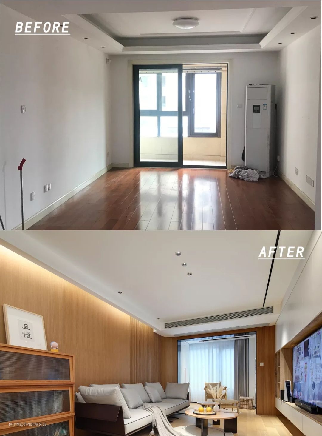 改造前: 简单装修,大白墙,回形吊顶配吸顶等,非常低配的设置,而且还是老式的立式空调,非常占空间。而且阳台和客厅之间的处理关系,对采光也没有得到优化。 改造后: 选择安装中央空调,藏于吊顶,将空间的利用率提升。顶面留白做边吊,配合无主灯设计,让空间显得更加明亮,增强通透感的同时,视觉感也被放大了。