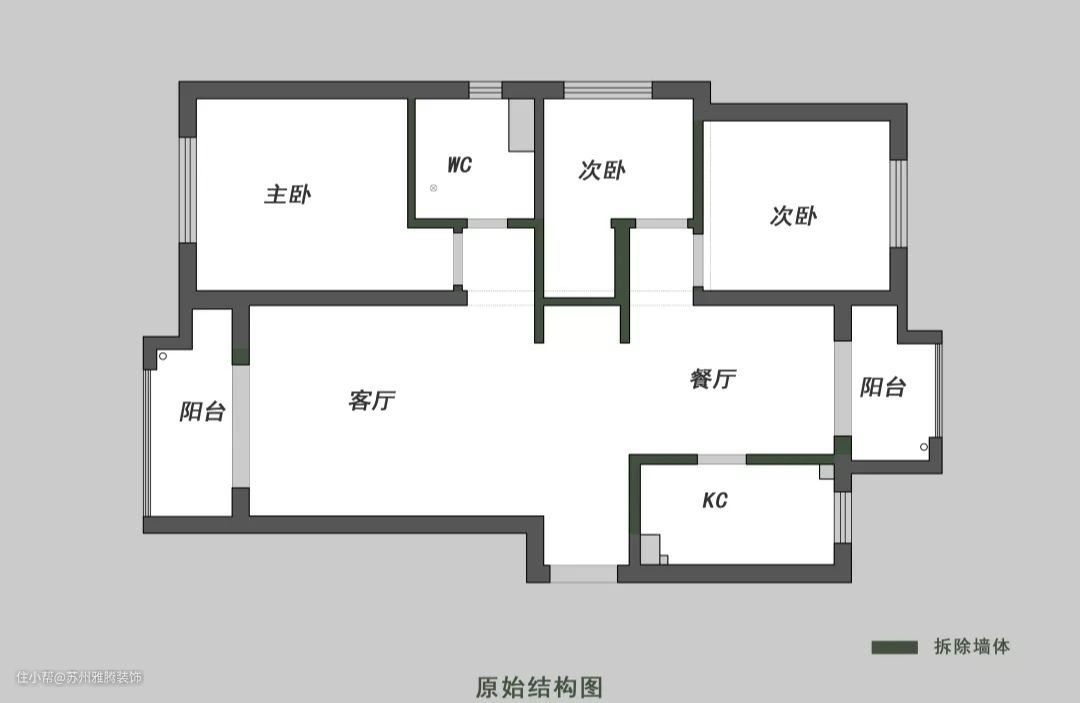 改造方案 1、把原始得厨房空间的墙体进行拆除,做成了L型的玄关区域,引入自然光线的同时,有了强大的入户收纳功能; 2、将北阳台纳入,代替厨房空间,做成U型,合理规划布局,原阳台的大面积的窗户,相对原始厨房,采光得到了提升: 3、把次卧延伸出来的墙体拆除,让整个静区空间更为方正,再进行分区来优化动线; 4、将主卧原来的门洞拆除,进门位置内推420mm,使其成为方正空间,连接其他空间的外部,形成方正的过道区; 5、利用过道的凹凸区结合卫生间,实现三分离; 6、3拆除次卧开门被堵的墙体打通空间