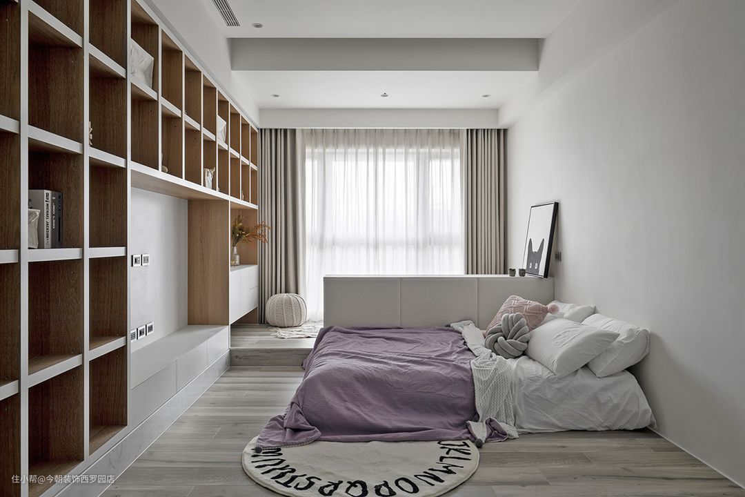 仍是在学期间的女儿,喜好北欧简约风,极简中注入女孩感成为主调,临窗处,架高一地可卧可坐区域,建构整列木作,透过两种手法,内层贴皮、外部喷漆,流动温润北欧质感,并涵纳圆弧收边柜体与运动区,动静皆宜卧房。