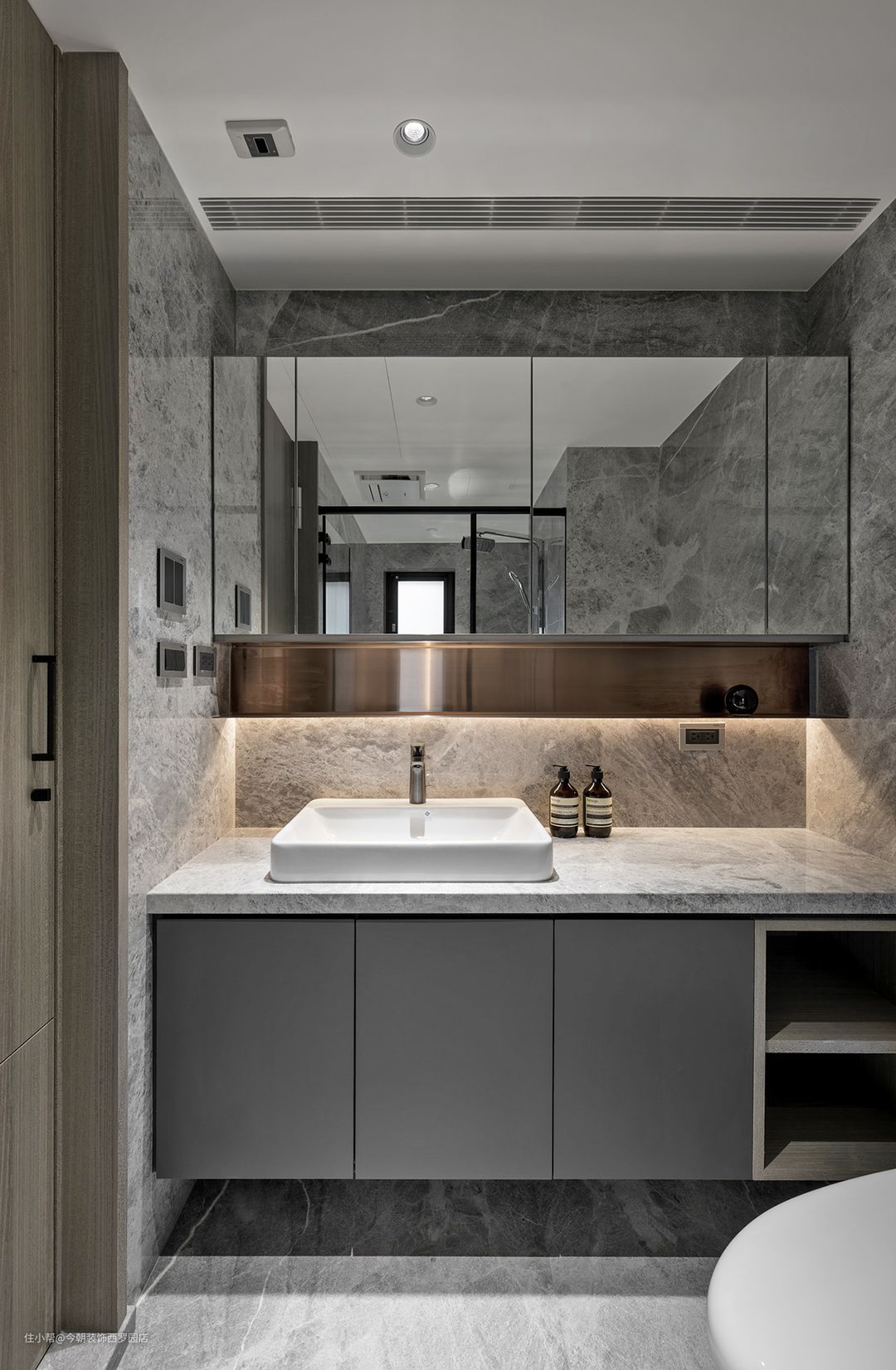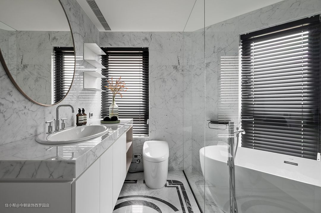 主卫石材为主角,是屋主指定用材,但石材不适用湿处,工法上则须细细思量,像是要避免水泥黏著剂,而使毛细受潮,為使精品卫浴姿态显著,并契合洗沐习惯,打造长檯面洗手檯、挹注单体浴缸,使生活备感安适一处。