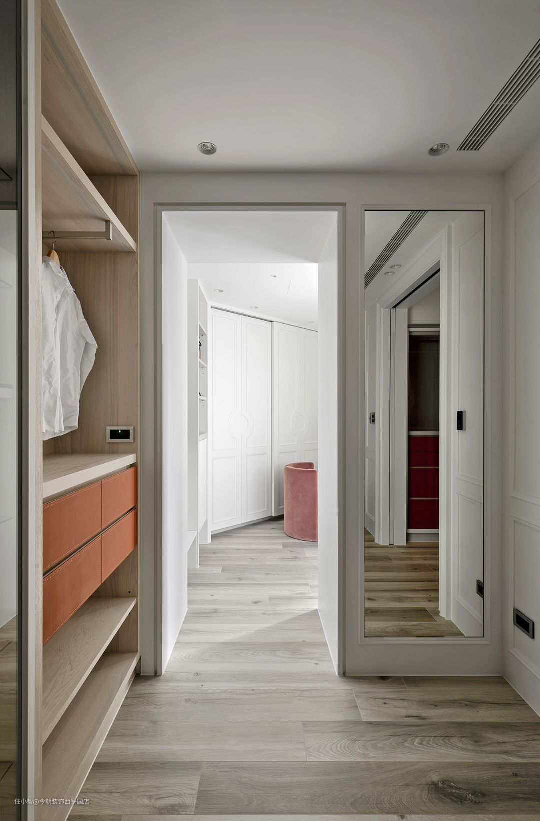 走进一过道,即抵更衣室,也是进入主卫浴之处,恰好符合女屋主卸妆、更衣、沐浴使用习惯。