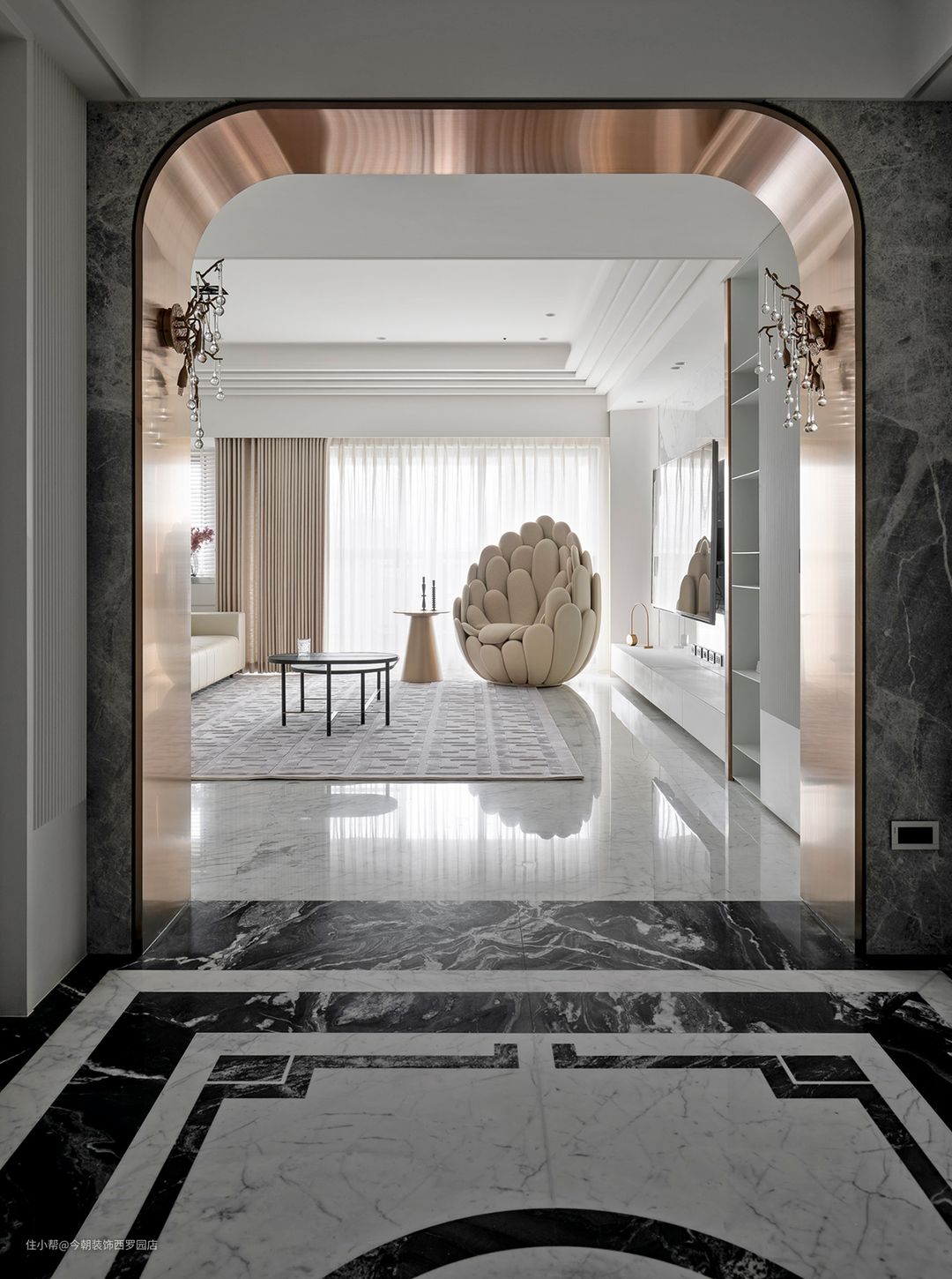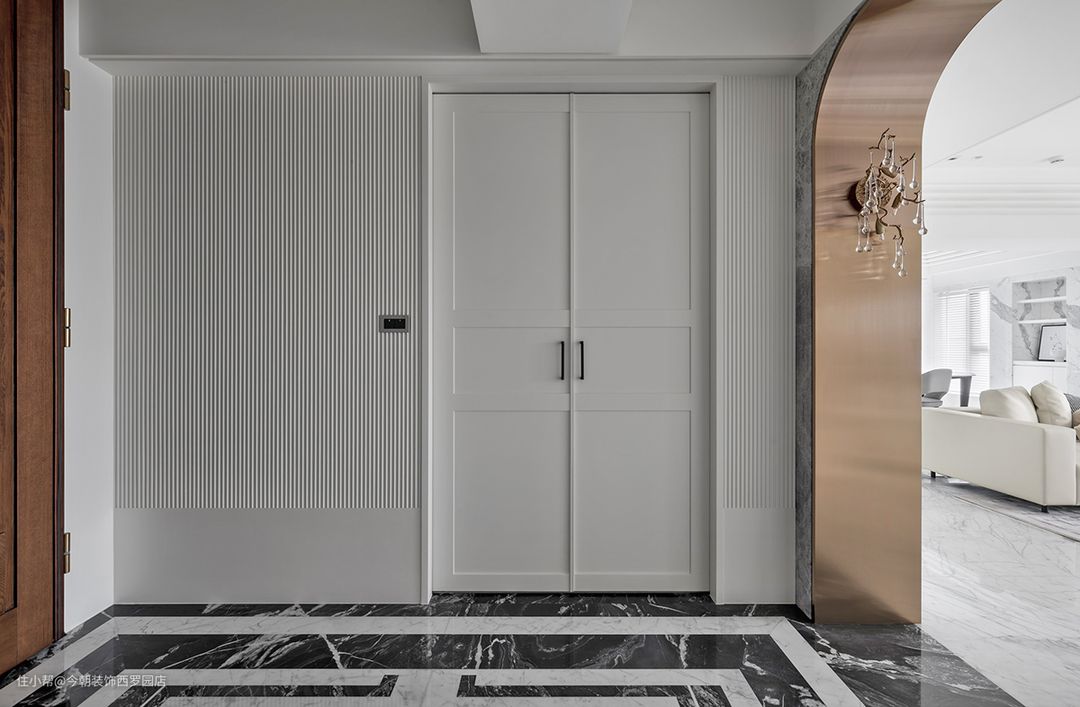 入门一道拱形,正是引建筑结构,成为室内语汇,若回溯拱形初始,就会看到圆拱顶到拱形结构等演变,呈现西洋美学一脉相承文化,在面积阔绰之下,特别以拱形,作為内外过渡,穿引出入步履周折,更形塑渐而开阔视野,缔造空间层次感。