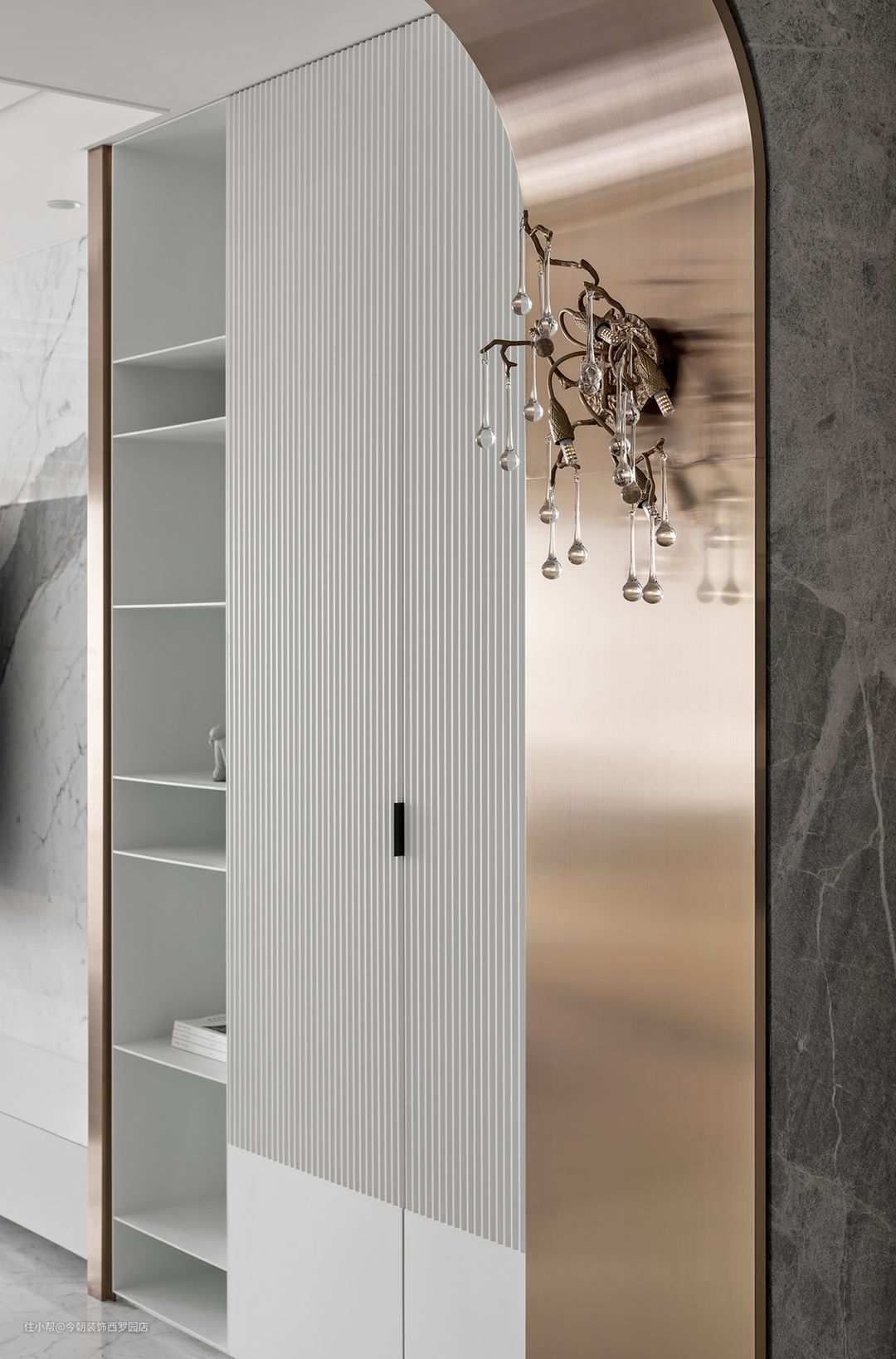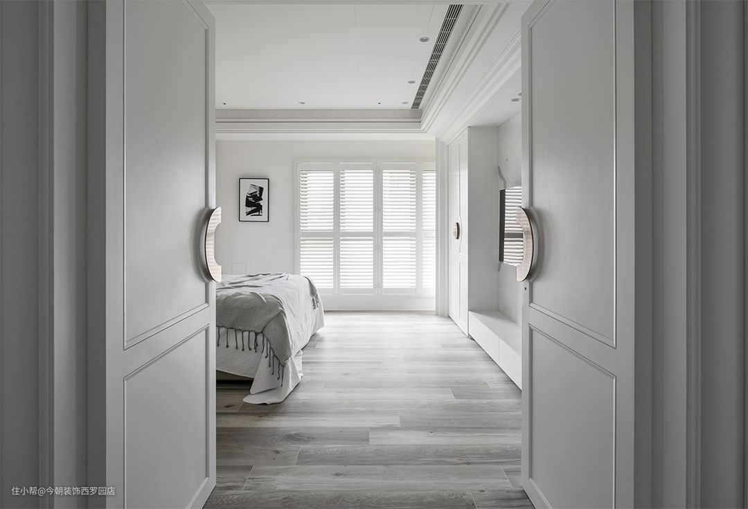 双开门片使欧式情调缓入卧眠区,微古典在全新铸造玫瑰金把手,揭开专属优雅,立面除了波纹板、镀鈦金属,透过线板赋予衣橱样式,侧旁再以欧风强烈木百叶,为揽光之窗,使休息回归享受每一片刻。