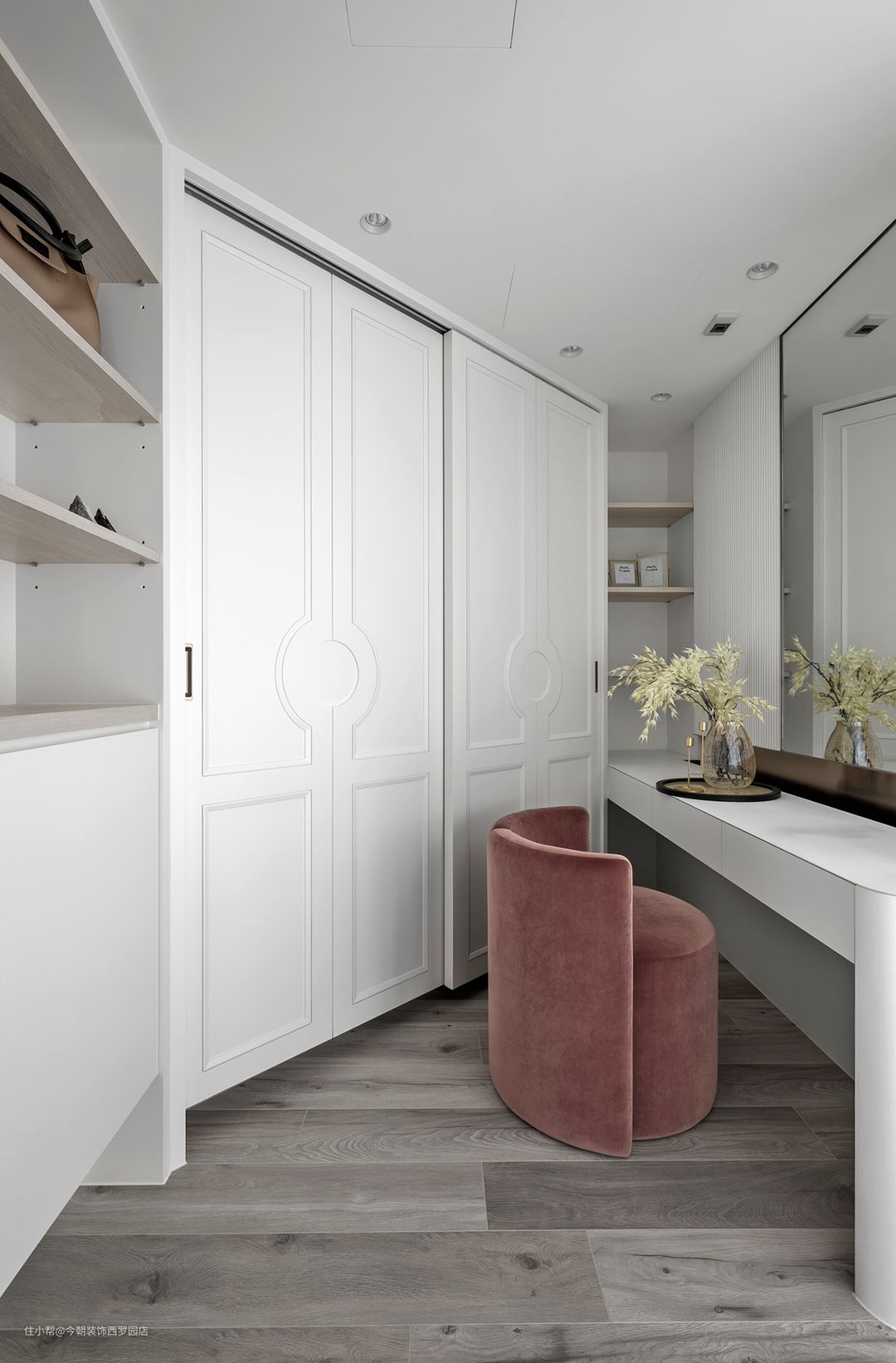 衣帽间衣柜底下留出缝隙,放鞋,也较为好打理,粉色沙发椅给整个空间带来一丝温馨。