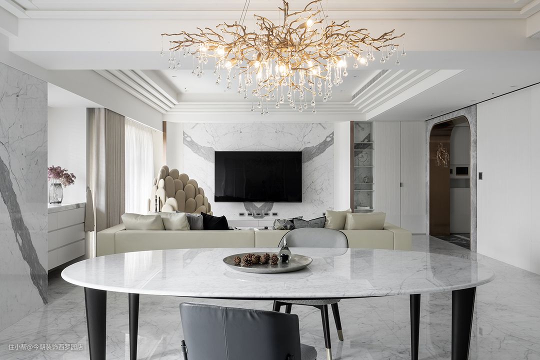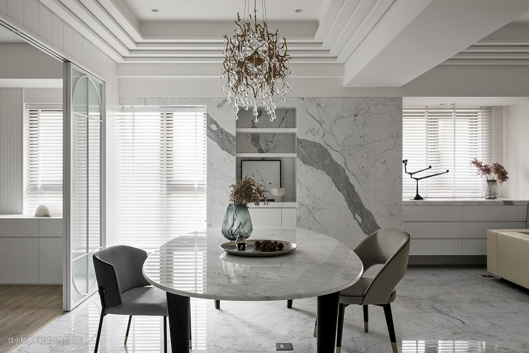 客厅与用餐区上方有一道大樑,恰作为区域分野,使多层次线板造型,以两方框展现不同调性,吊掛一只晶莹透亮水晶吊灯,视线彷彿瞬间从纯白场域,落到光之灿灿,凝聚温暖氛围。