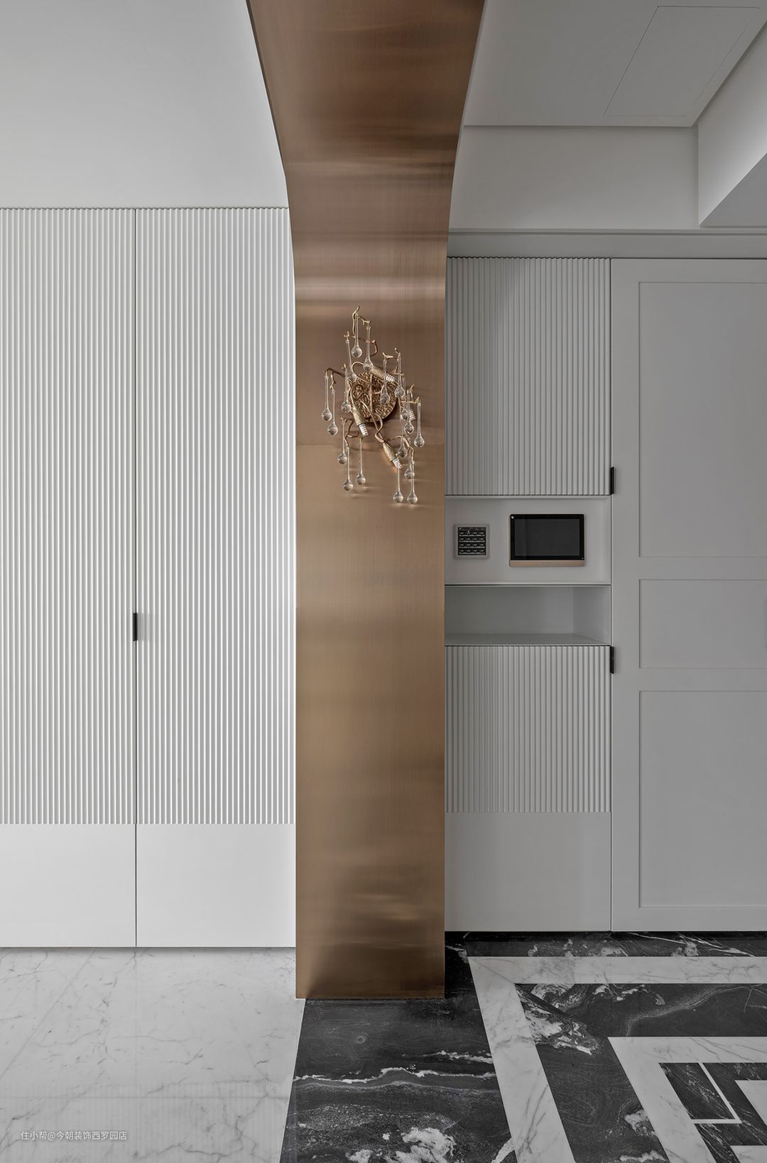 透过一式镀鈦不锈钢,作為玄关起承转合,起於泼墨山水与小雕刻石面地坪,转幻於镀鈦玫瑰亮面色泽,注入大器风范,旋舞出一丝古典纤柔温润之脉。
