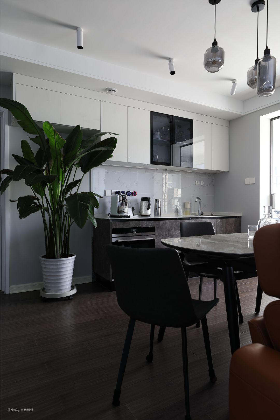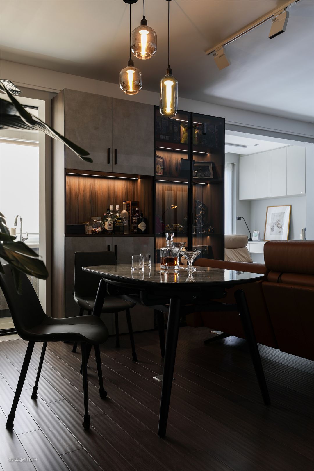 餐桌后方,以吊柜+落地柜做餐厅的收纳主力区。吊柜局部选择玻璃柜门,方便拿放物品,视觉上也更有变化。