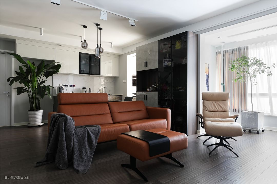 棕色皮质沙发的品质感不言而喻,与木地板和暖调光线搭配,有了时光沁染后的意味。一侧展示柜选择玻璃门,内搭灯光系统,放上旧日收藏,闲坐沙发,往日时光触手可及。