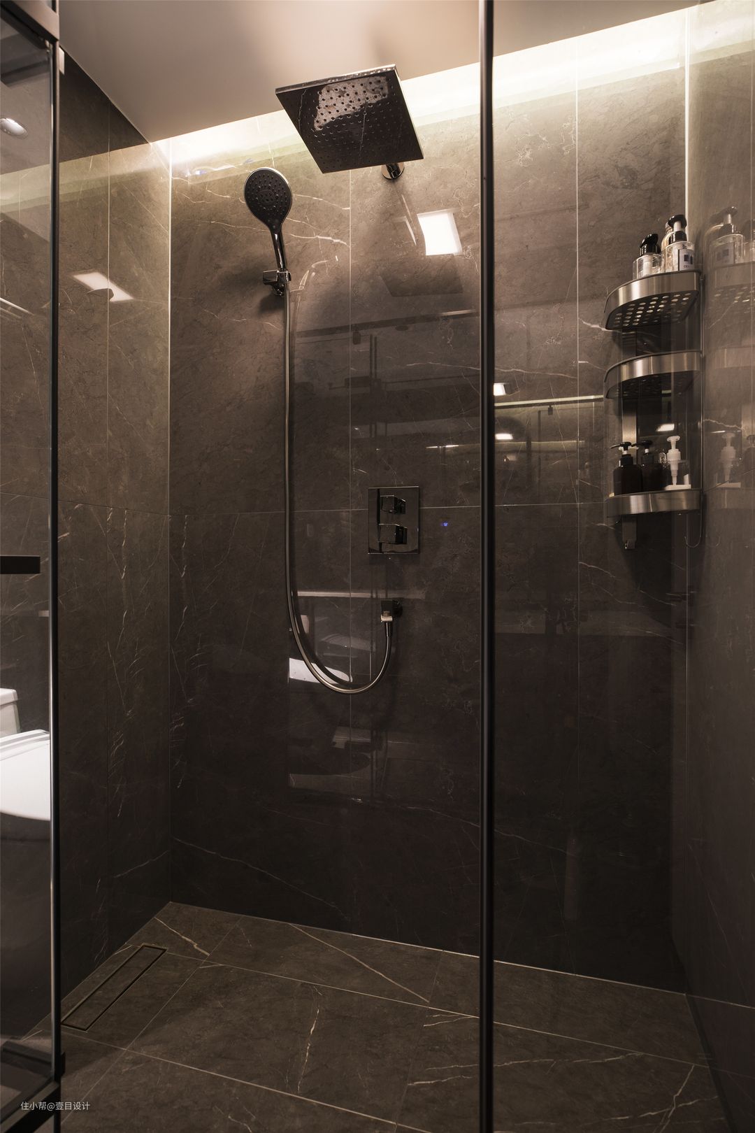 淋浴区与马桶区以通透玻璃门隔开,空间独立性得到凸显。淋浴区利用墙角空间安装三层置物架,收纳上墙,最大化发挥空间功能。 #主卫 #卫生间 #洗漱台 #马桶 #淋浴房 #毛巾架 #浴室镜 #浴室柜 #入墙花洒