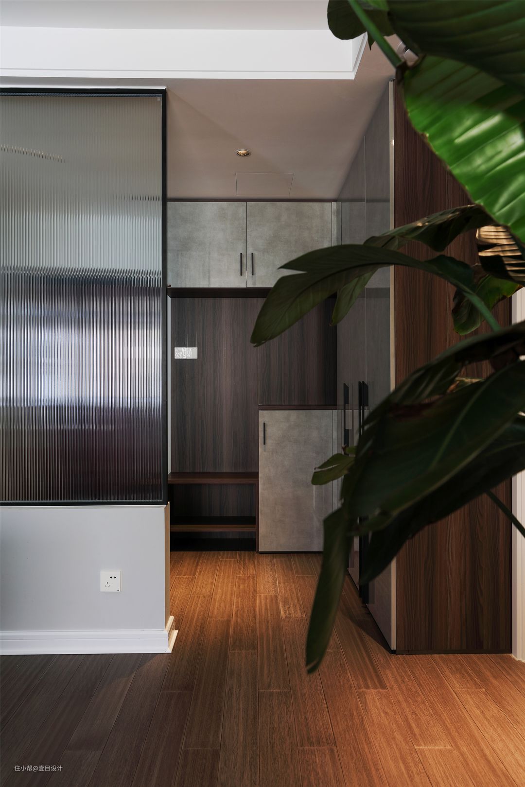 原有玄关区入户可见餐厅,为了明确空间功能,以半墙接长虹玻璃的形式作出一面玄关墙,玻璃材质不会影响玄关区采光,一墙分割,也避免了入户后的一览无余。 #玄关 #鞋柜 #挂衣区 #换鞋凳 #屏风隔断 #长虹玻璃 #门把手 #木地板