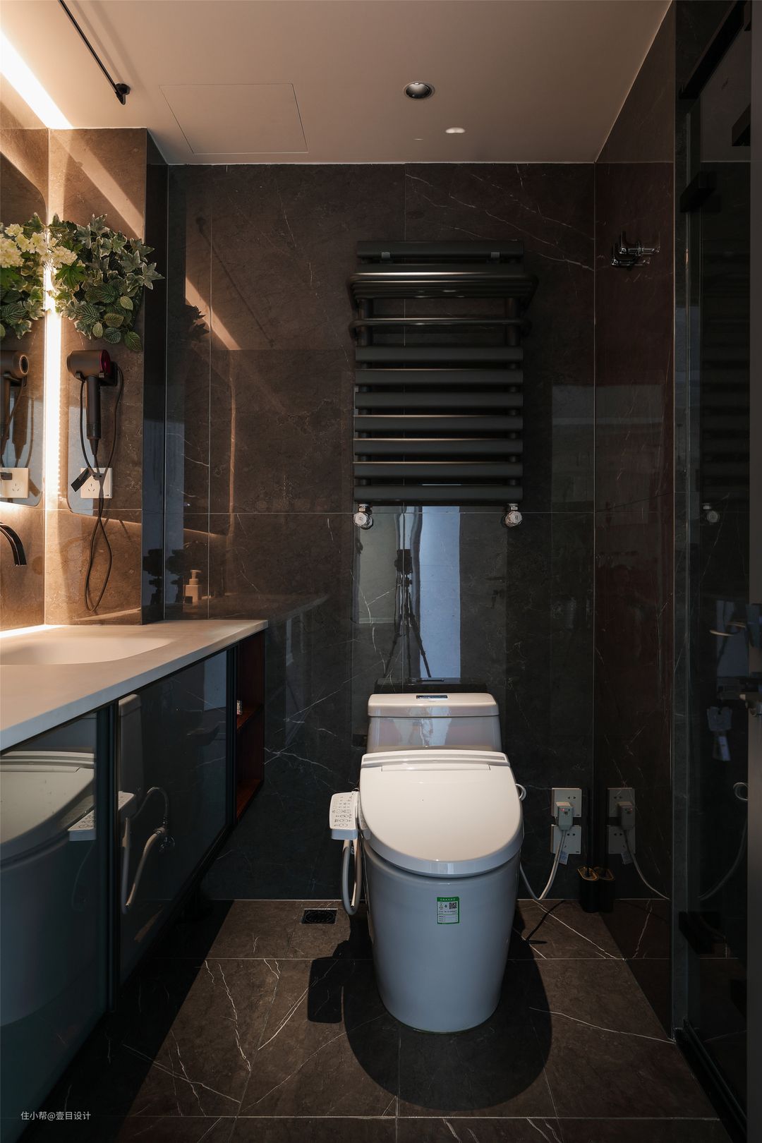 主卫根据空间原始状态延伸出超长的洗手台,并布置双台盆,夫妻二人同时段洗漱也不用排队。台盆下方空间设计成储物柜,柜体储物功能强大,将日常洗漱用具尽皆收入其中,解放洗手台台面。 #主卫 #卫生间 #洗漱台 #马桶 #淋浴房 #毛巾架 #浴室镜 #浴室柜 #入墙花洒