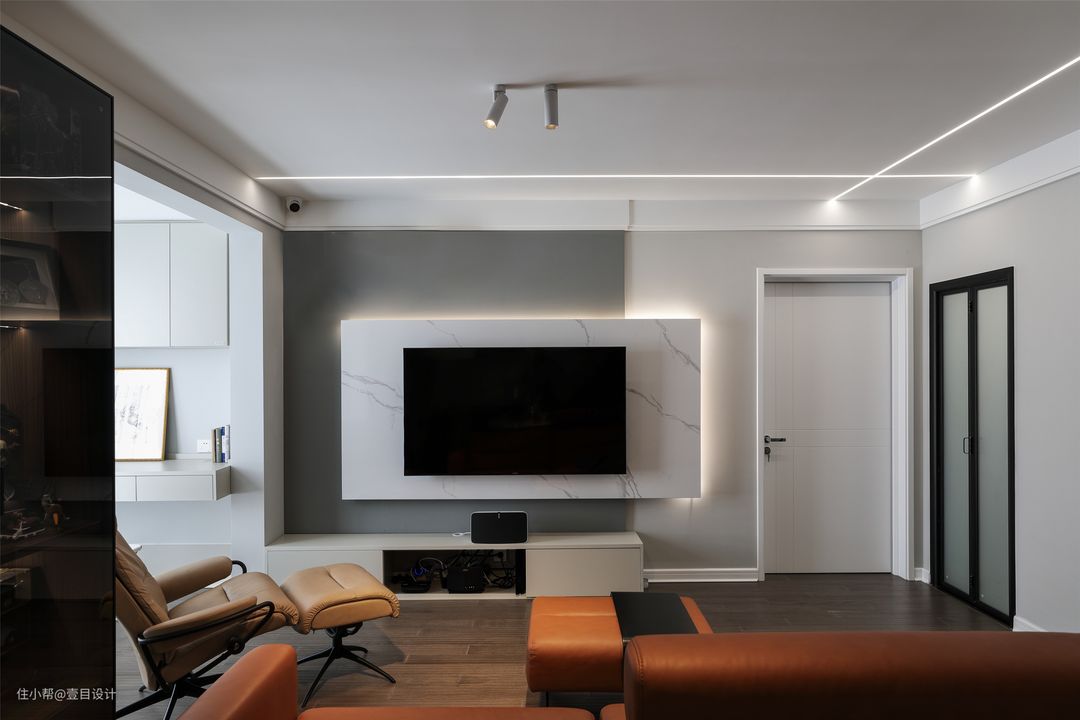 客厅照明选择多种光源结合,电视背景墙后嵌入的隐藏灯带见光不见灯,烘托观影氛围。顶部环绕的灯带搭配分列有序的筒灯,客厅完全被光域覆盖,不同色温的灯光交织,为空间染上一层神秘色彩。