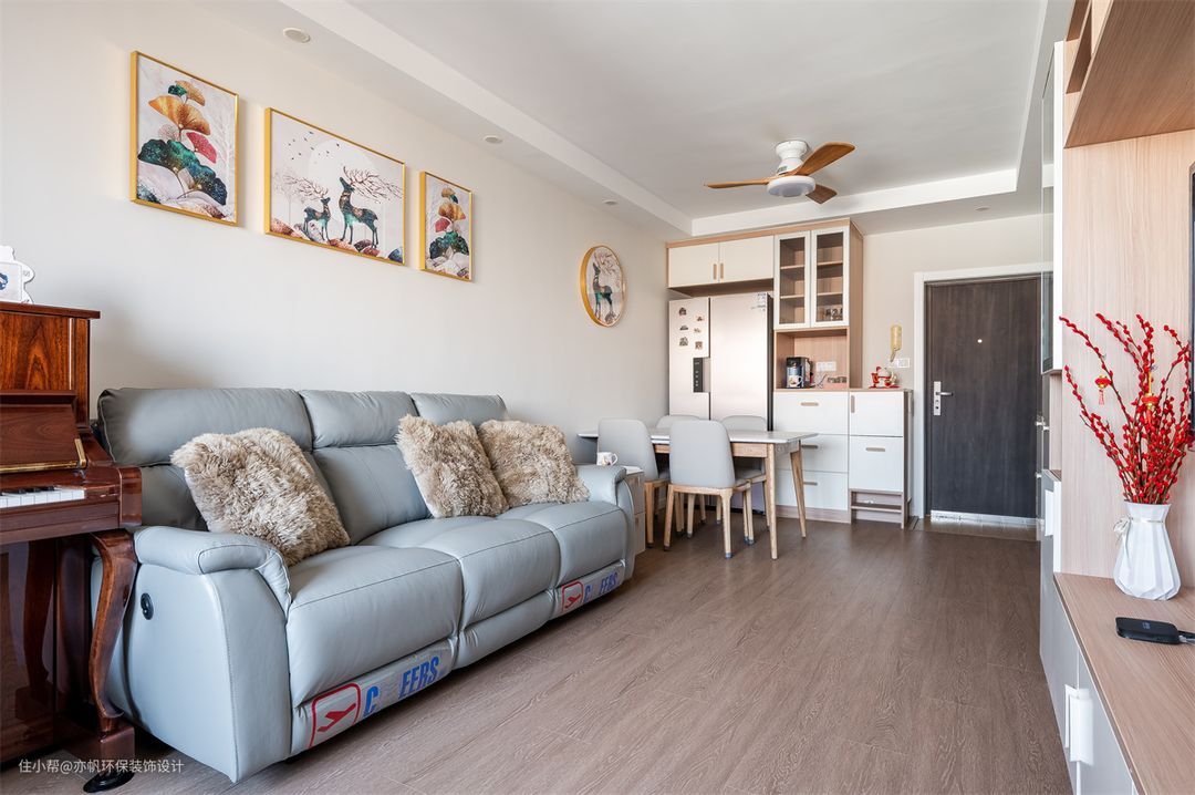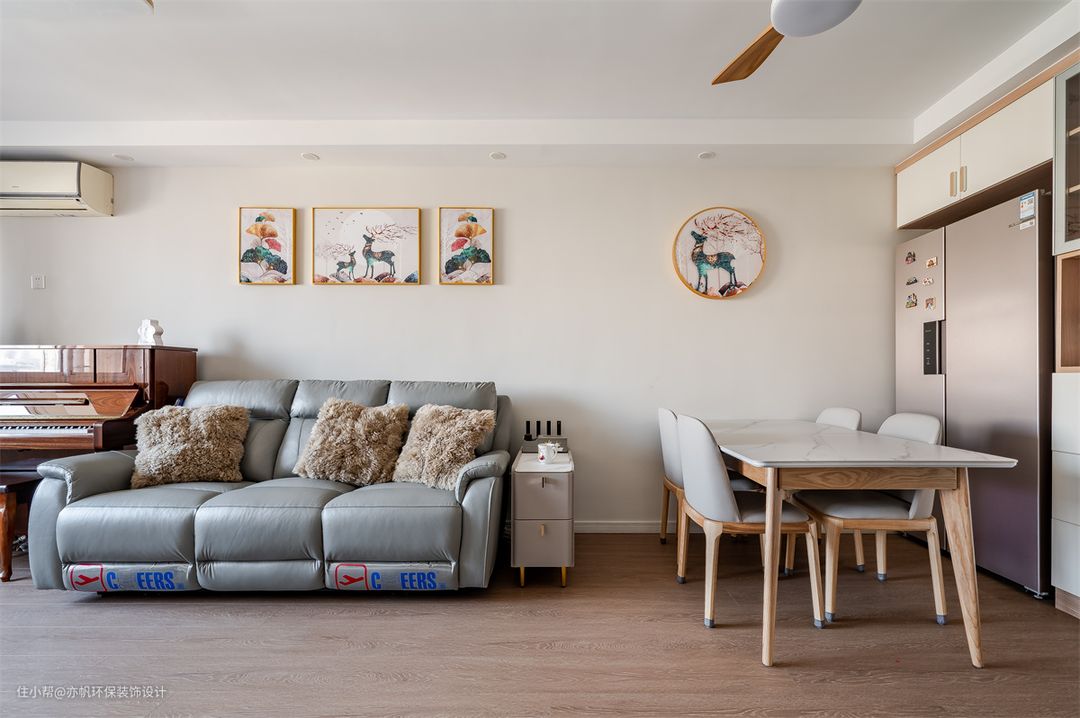 白色墙面+木色地板,舒适的三人沙发旁边是一台钢琴,可爱的艺术画装点了墙面,营造出舒适温馨的ins风简约家~