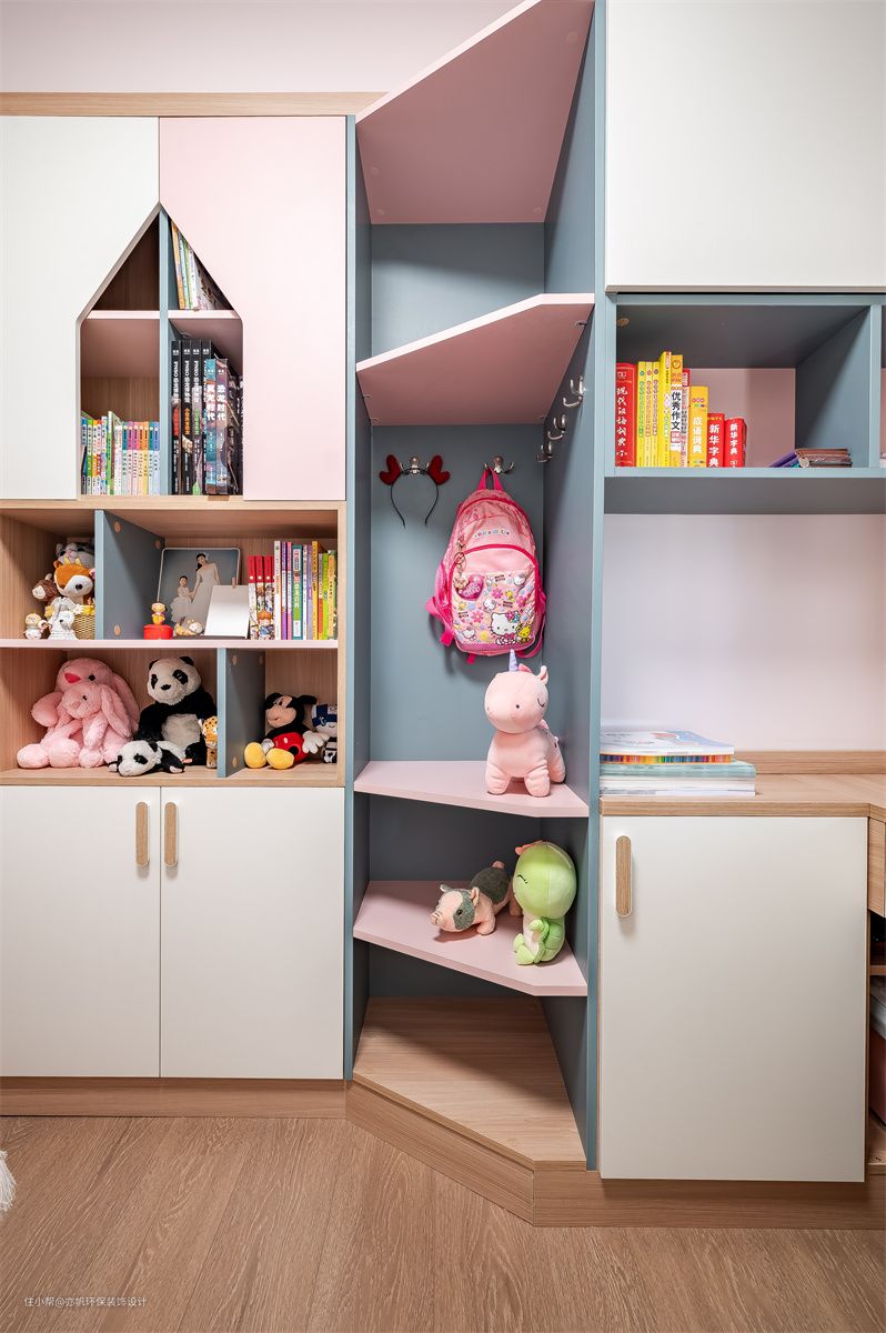 女儿的房间是梦幻的浅粉色,童趣十足。靠近走廊的墙面由双墙变为单墙,打造了整排收纳组合柜,储物空间翻倍。