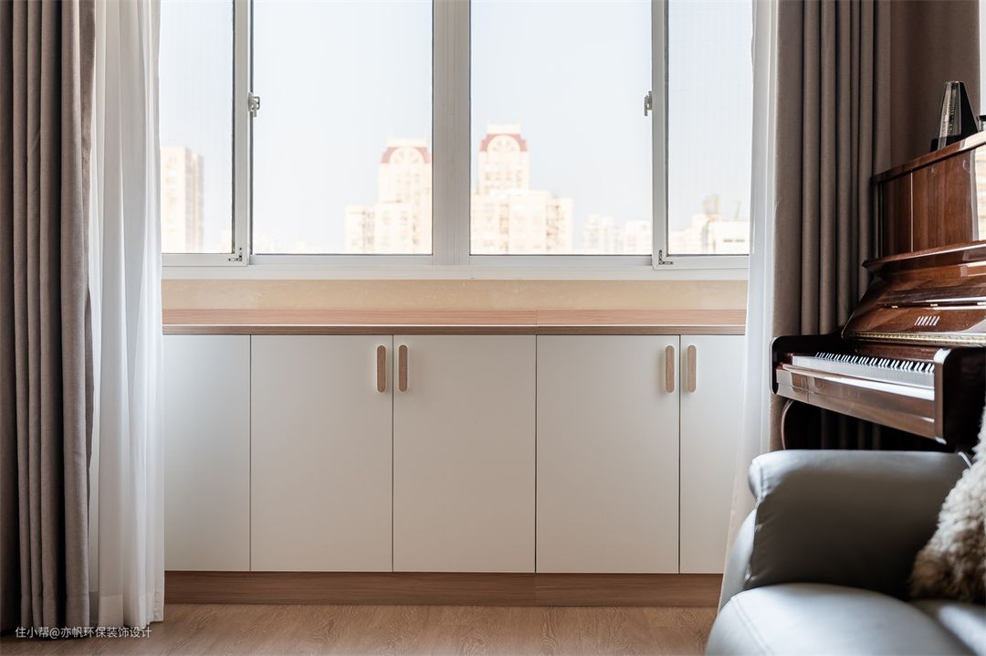 阳台安装了整排半高的收纳柜,增加更多储物空间。