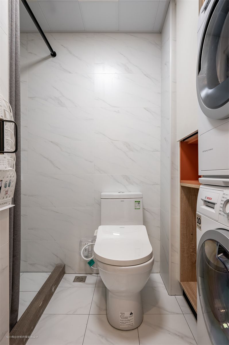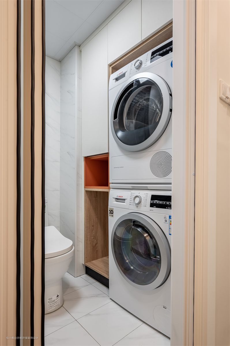 洗衣机烘干机被嵌入卫生间的淋浴区,旁边的位置安装了收纳柜,杂物收纳空间更多。