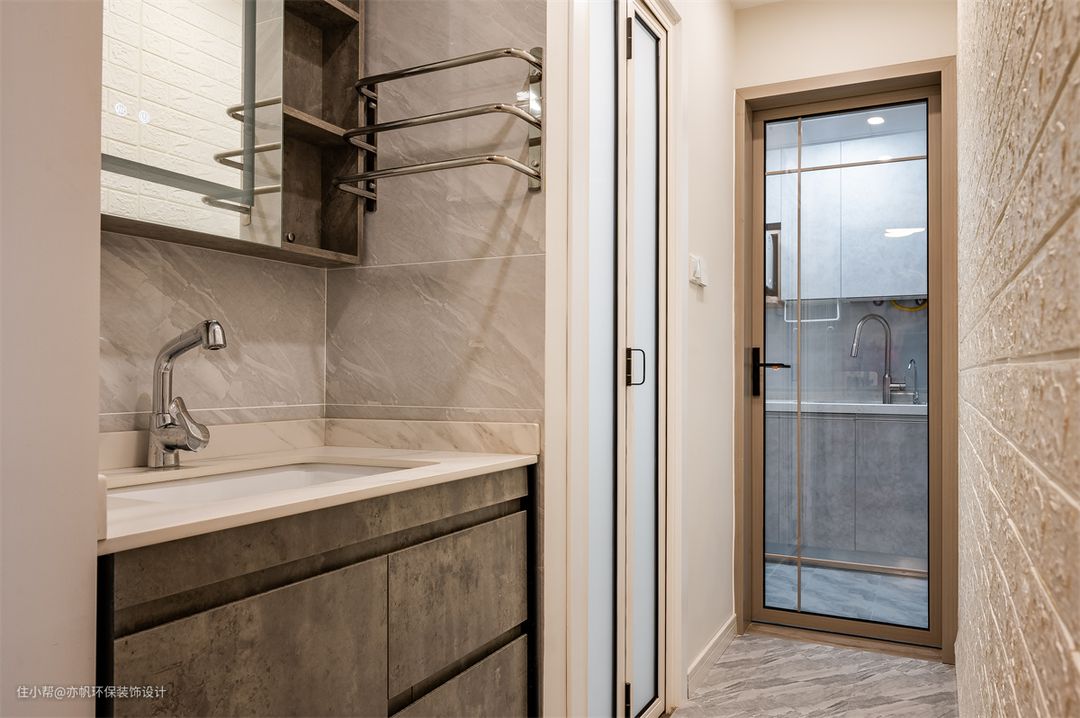 原卫生间没有干湿分离,出来便是一个小走廊,十分浪费,设计师将部分卫生间墙壁向内移动,把洗漱区放到外面,实现干湿分离。