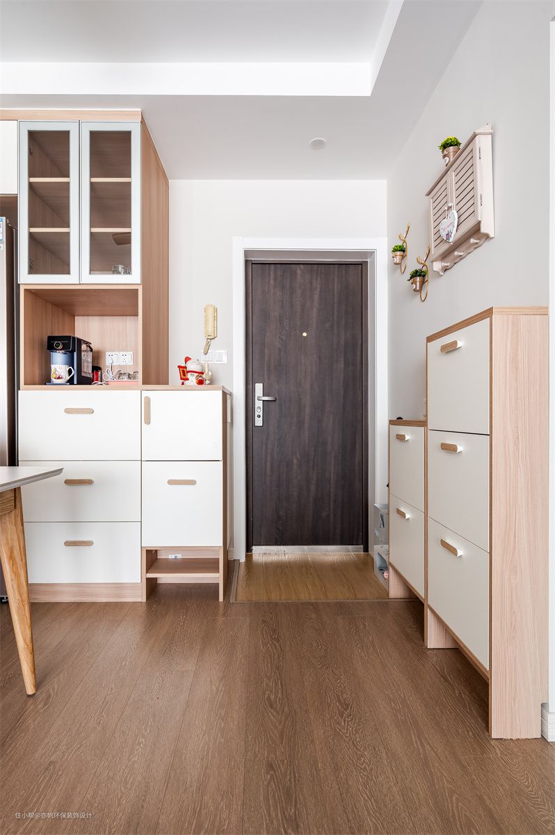 进门之后,沿着入户门左侧墙体,设计了靠墙的玄关柜,家里的鞋都可以收纳其中,使得整个入户门区域能够保持干净整洁。