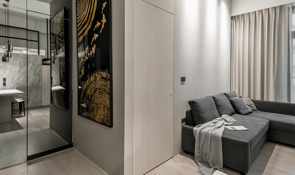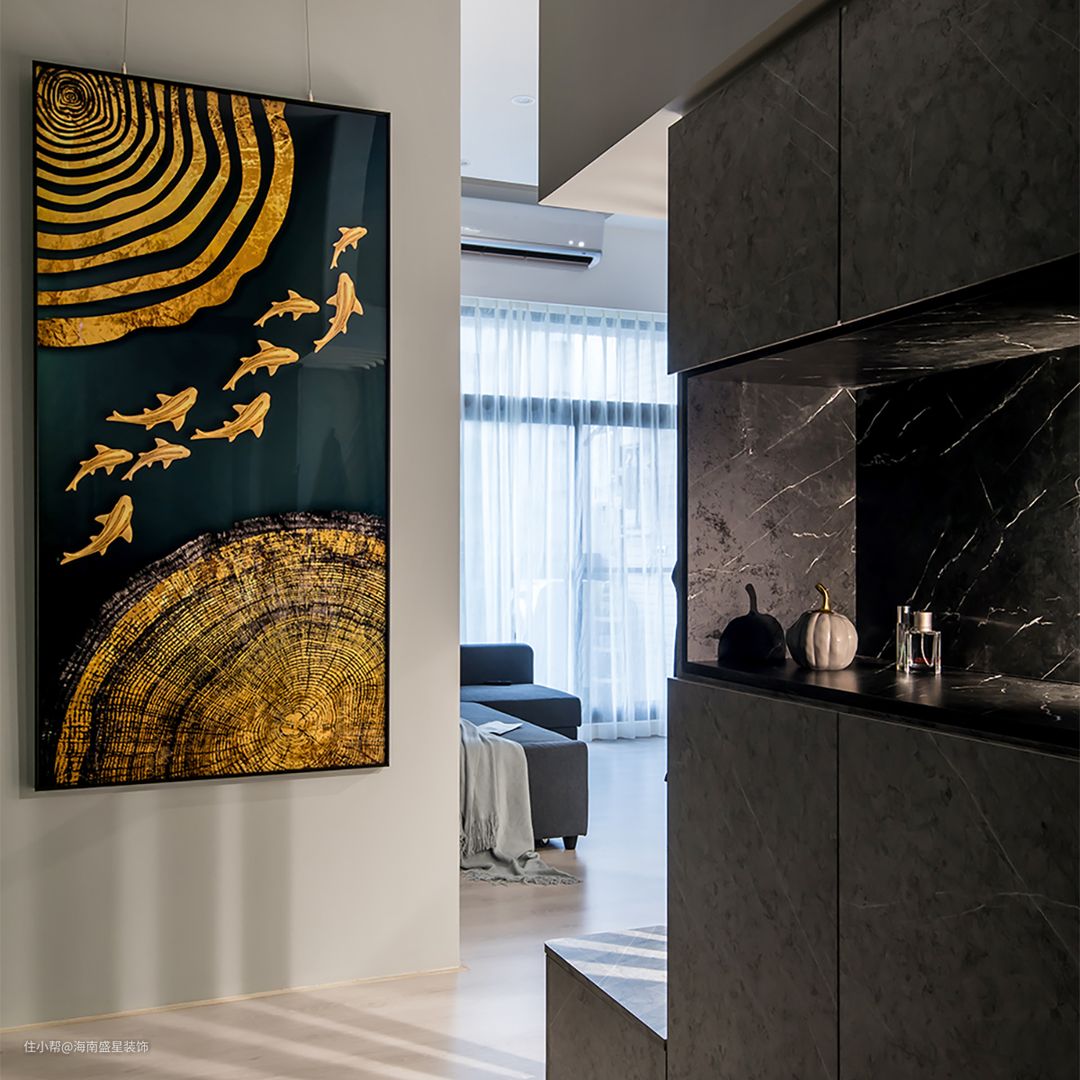 拆除旧有内玄关,立面后退至沙发背墙,由于屋主经商,特意挂置一幅“九鱼图”,在风水上讲究招财,右侧以灰镜与仿石纹系统板,构筑储物柜体,上下带有门片柜体,中间则打开一处于出入时,便于随手拿取的开放台面。